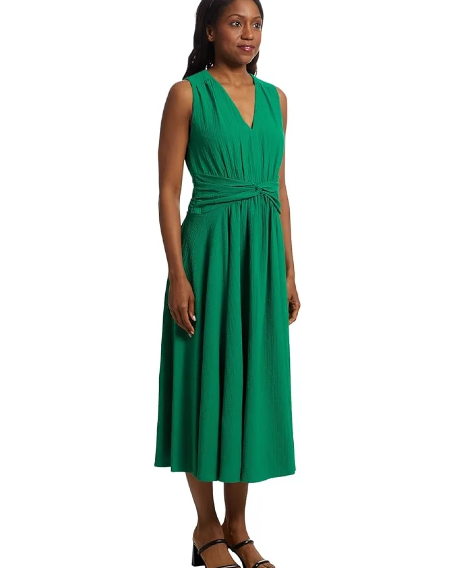 - From brunch to ballrooms, look graceful, and elegant wearing the Calvin Klein® Gauze Twist Front Aline. This dress features V-neckline, sleeveless style, zippered back closure, twist detailing on the front waist, and midi-length silhouette.