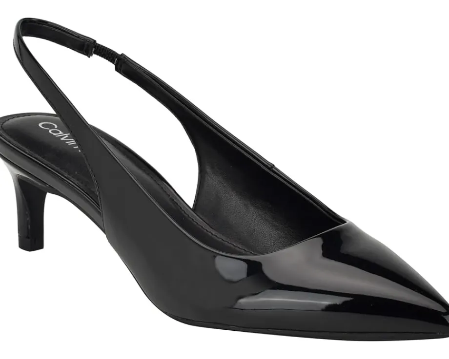 - Be ready to jealous your friends at the party by wearing the stylish and trendy Calvin Klein® Dainty heels. These kitten heels are designed with pointed toe design, elasticized slingback strap closure, and faux patent leather upper.