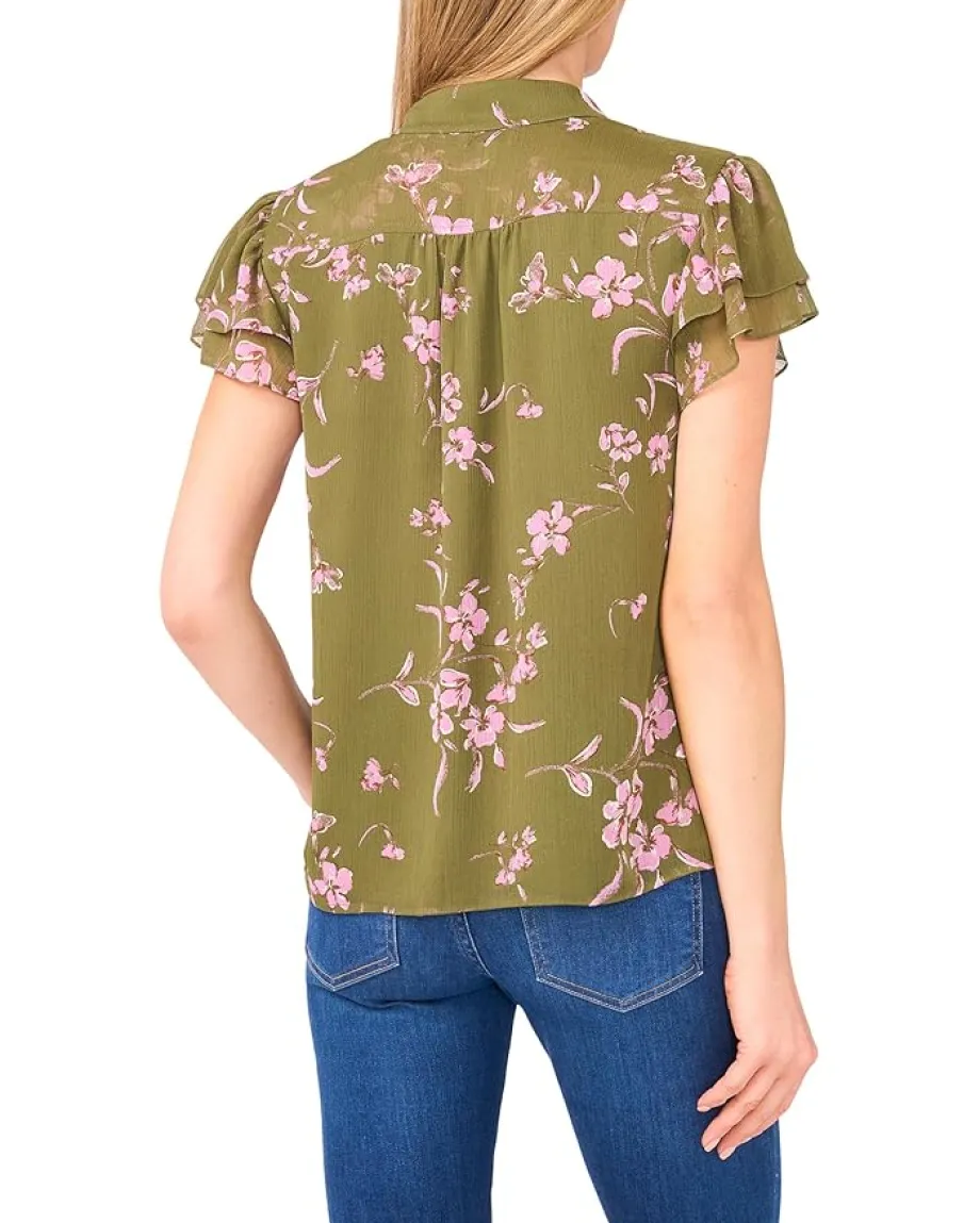 - Flowy and flirty, the CeCe™ Long Sleeve Tie V-neck Ruffled Top brings instant polish to your everyday style. Designed in a classic fit, this blouse features a romantic tie-front V-neckline and delicate ruffled short sleeves that add a soft, playful touch. The Mandarin collar lends a hint of sophistication, while elasticized sleeve openings ensure a comfortable fit that moves with you. A hidden snap-button front closure keeps things neat and stylish, and the body-lined design offers effortless coverage.