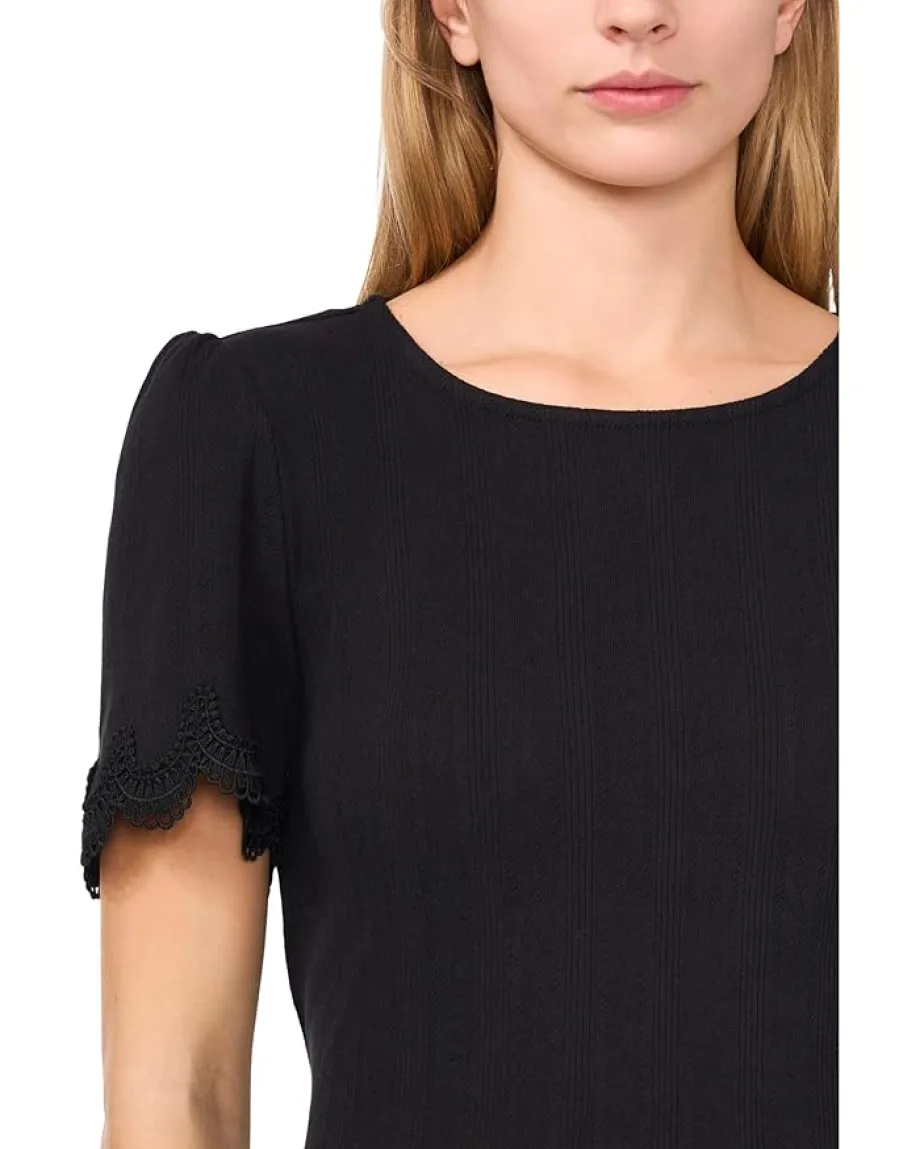 - Create an aura wearing the stylish CeCe™ Short Sleeve Tee With Lace Sleeve Opening. The standout feature of this design is the charming lace sleeve opening, which adds a touch of femininity and sophistication to a classic silhouette. The lace detailing beautifully enhances the short sleeves, making this top ideal for transitioning from day to night effortlessly.