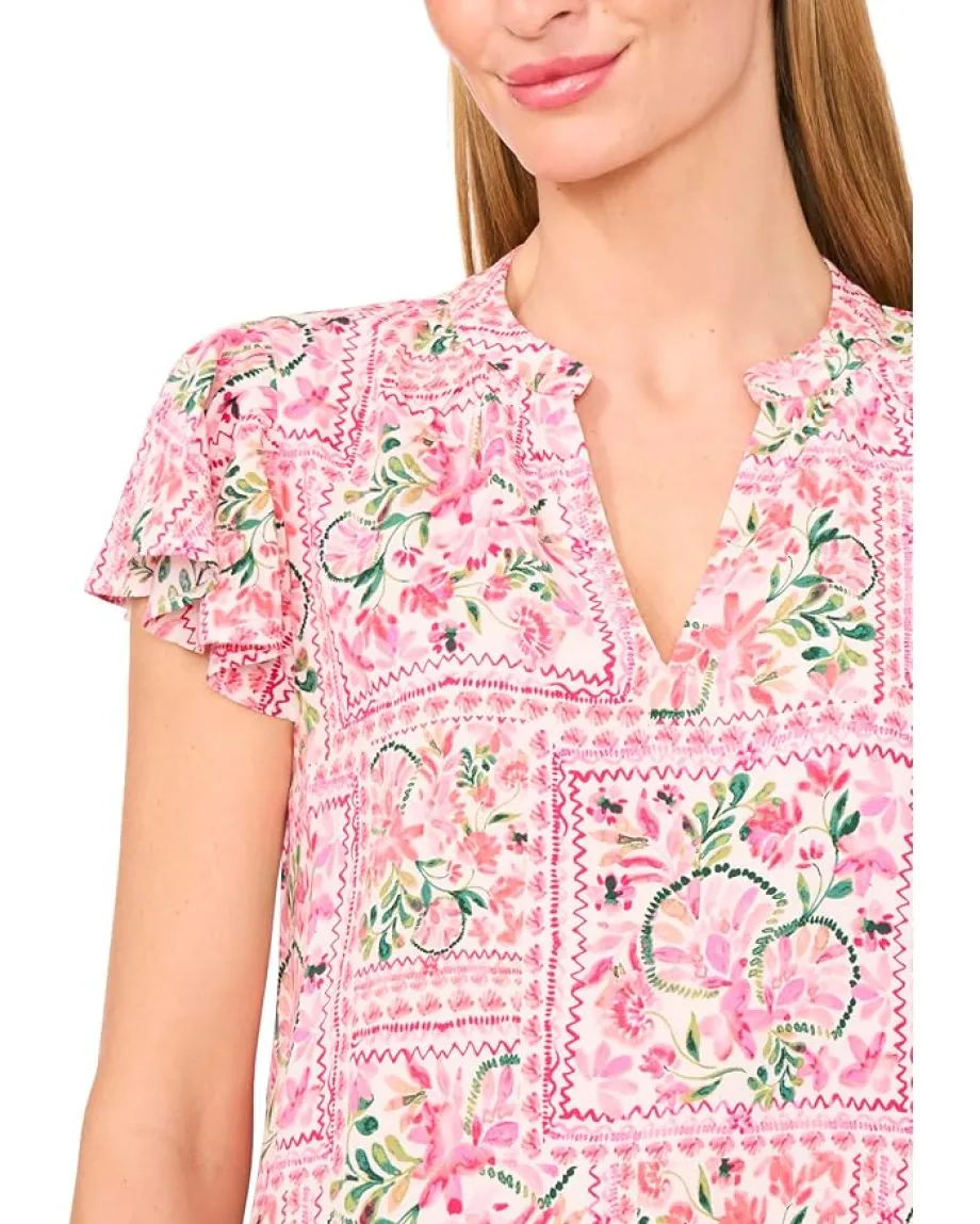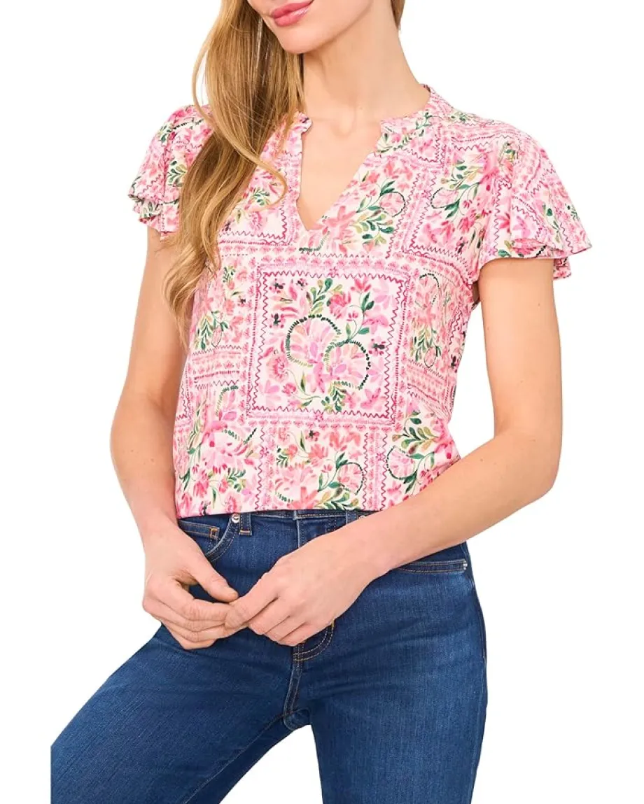 - Level up your look wearing the CeCe™ V-Neck Shirred Flutter Sleeve Blouse with an allover floral print. The V-neck blouse features a shirred front neckline and delicate short flutter sleeves, creating a soft, elegant silhouette. With its lightweight fabric and flattering embroidered details, it’s the perfect blend of comfort and style for both casual and dressier occasions