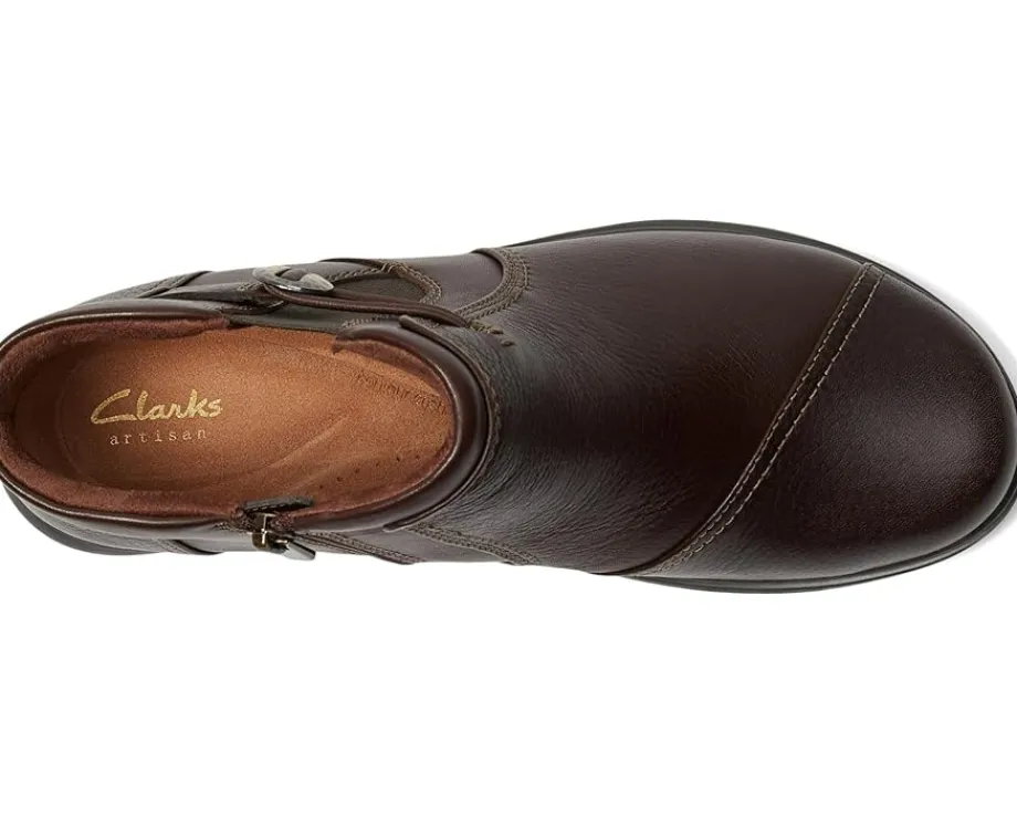 - An elasticized gore panel and side zipper for easy entry accentuate the Clarks® Certina Joy Ankle Boot. Featuring a roomy round toe shape, the footwear has leather upper, lining, and suede insole.
