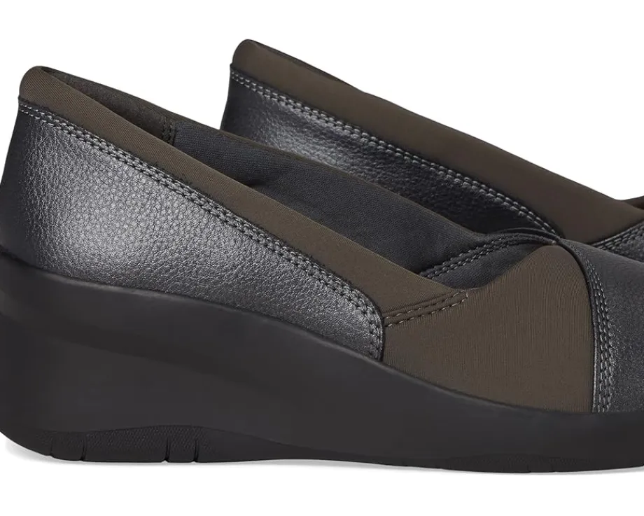 - Perfect for all events, the Clarks™ Suttyn Walk Shoes add both style and comfort to your feet. These slip-on style shoes feature a leather upper with a plain toe shape, mesh lining, and a cushioned leather insole. The wedge heel detail adds style to the look.