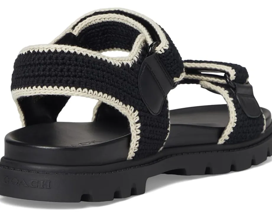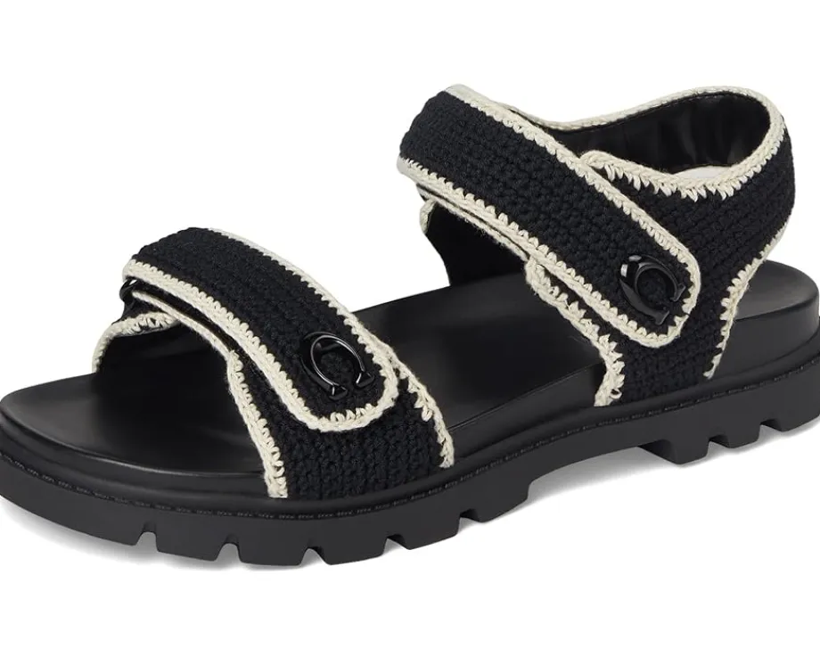 - Comfort and functionality blend together in the COACH® Brynn Crochet Sandals. Crafted with a crochet upper, man-made leather lining, and man-made leather footbed, these open round-toe sandals offer enhanced comfort with every step you take. The double hook-and-loop closure and backstrap ensure a secure fit.
