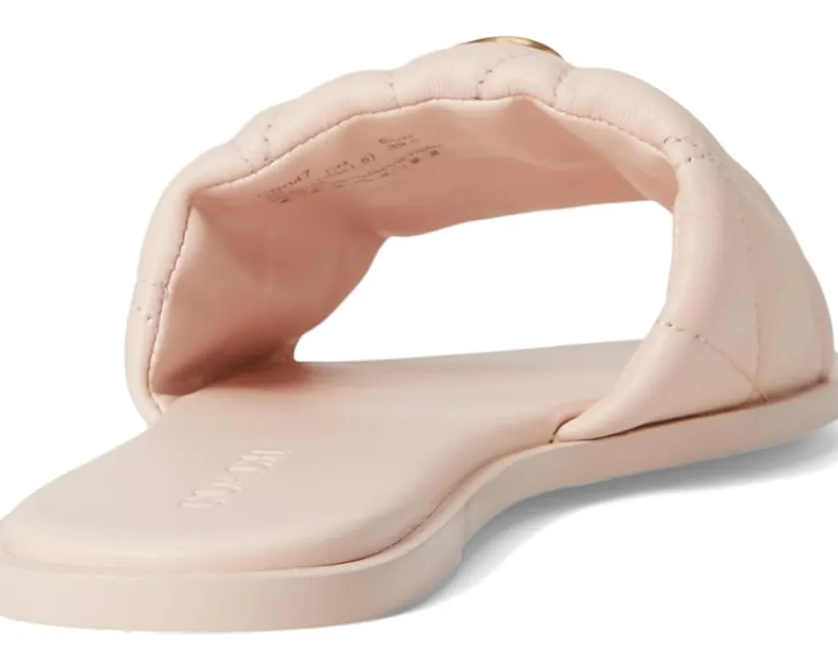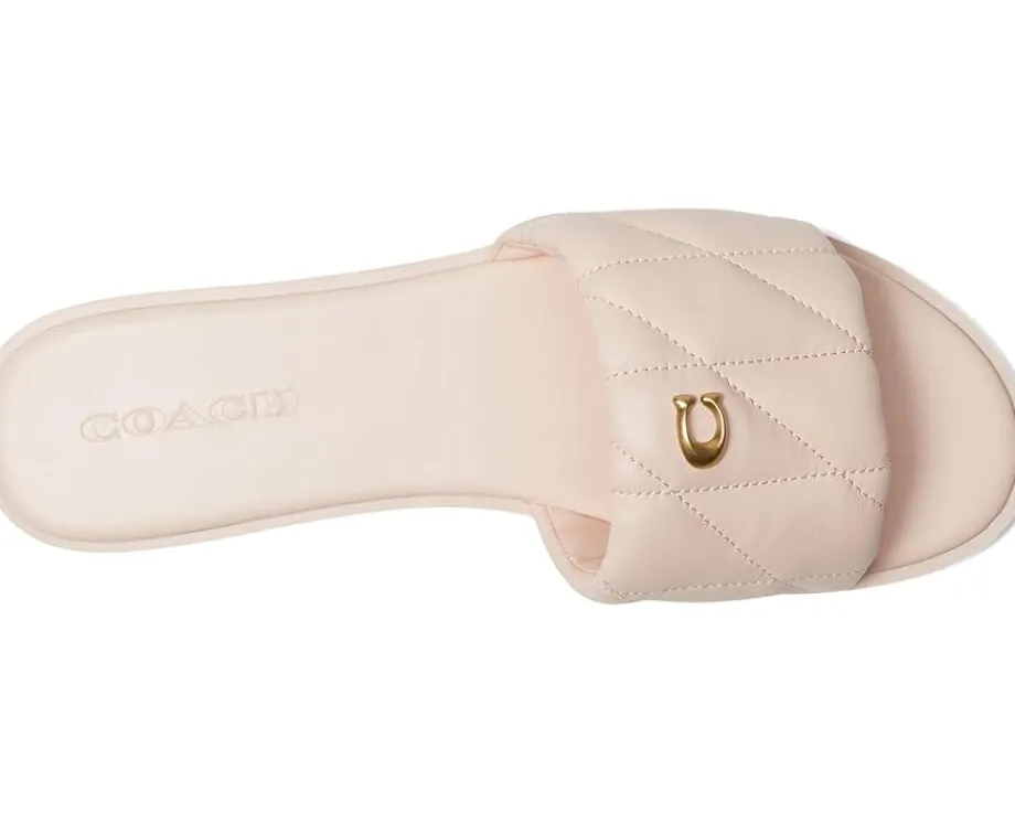 - Enjoy the barefoot freedom wearing the COACH® Holly Sandals with Quilting. Crafted from leather upper, man-made leather lining, and rubber insole, this pair of sandals features open round toe, low heel, quilted wide strap on the vamp with gold-tone logo emblem, slip-on style, and brand detailing on the footbed.