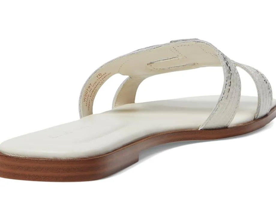 - Experience ultimate comfort showcasing fashion with every step in these slip-on style Cole Haan® Chrisee Sandals with smooth salpa welt and cushioned interlocking Iconic CH logo strap detail. These flats feature a slightly square-toe silhouette, lightly padded textile upper and lining, and rubber insole to delight you with comfort while providing superior styling. Boasts patented FlowerFoam™ rubber outsole for flexibility, traction, and comfort.