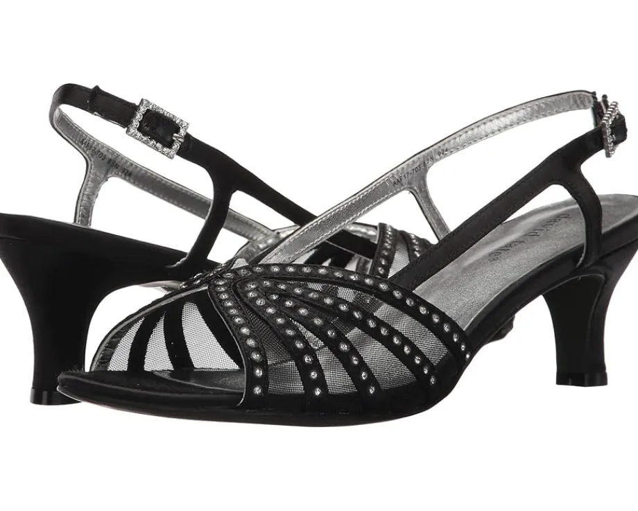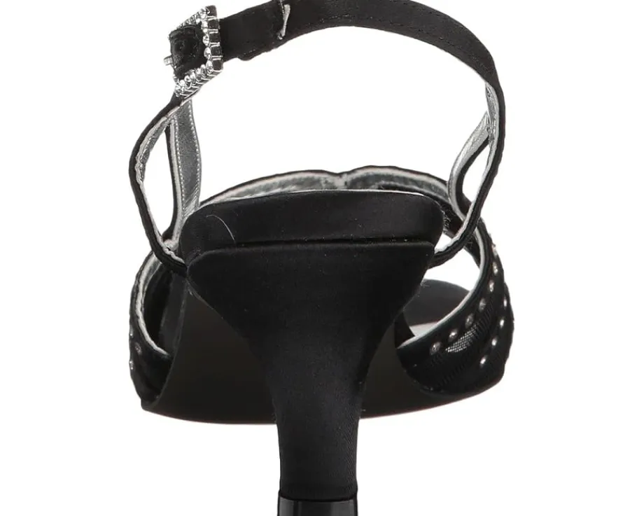 - Strappy satin uppers with decorative rhinestones and an open toe.
