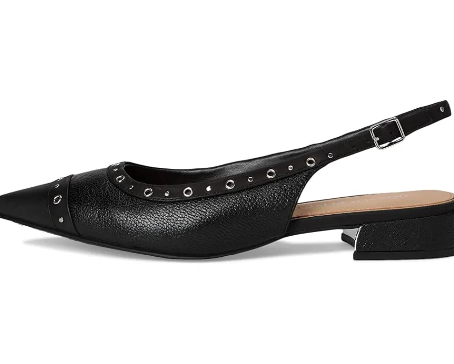 - The Donald Pliner® Lavinah studded slingback flat is the perfect fusion of modern edge and timeless sophistication. Crafted with a smooth leather upper, it features stud detailing that adds a rebellious yet refined touch. The pointed toe and low block heel create a polished silhouette, while the buckle adjustable slingback strap ensures a secure and comfortable fit.