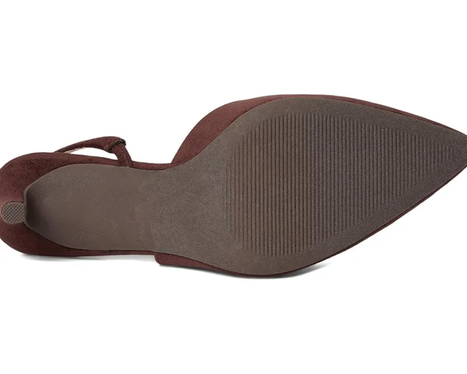 - Slingback strap with buckle closure.