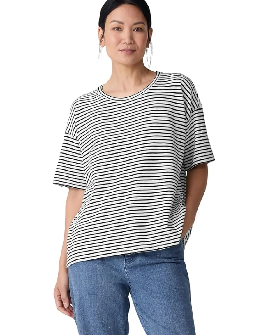 - From coffee runs to chill plans, the Eileen Fisher® Striped Organic Cotton Slub Crew Neck Short Sleeve Box Top is a perfect pick. It features crew neckline, short sleeves, standard length, relaxed fit, and pull-on style.