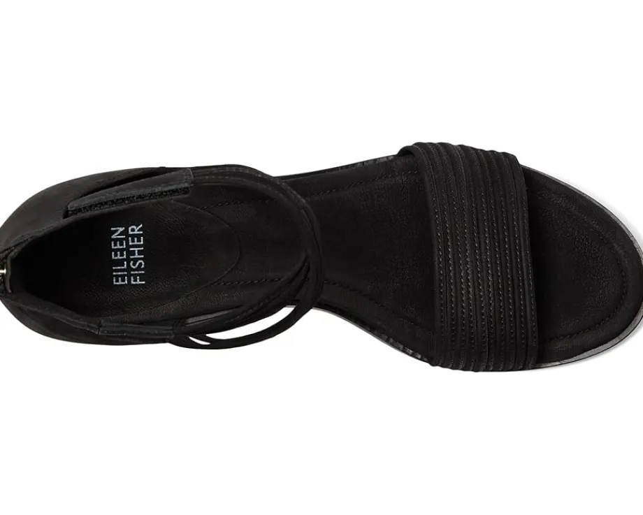 - Feel the endless comfort wearing the Eileen Fisher® Viro Sandal. Crafted from leather upper, lining, and insole, this pair of sandals features open round toe, low block heel, multiple bands at the front of the shoe and at the ankle, and back zippered closure for ease. It comes with brand detailing on the footbed.