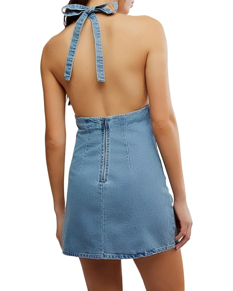 - Stylish meets fierce in this denim dream! The Free People™ Trevi Denim Mini turns heads with its effortlessly cool vibe and sweet-yet-sultry silhouette. Crafted in soft, durable denim, this staple stunner features a plunging halter neckline and defined cups at the bust for an ultra-flattering fit. The classic A-line shape keeps it timeless, while the open back and zip closure add just the right amount of edge.