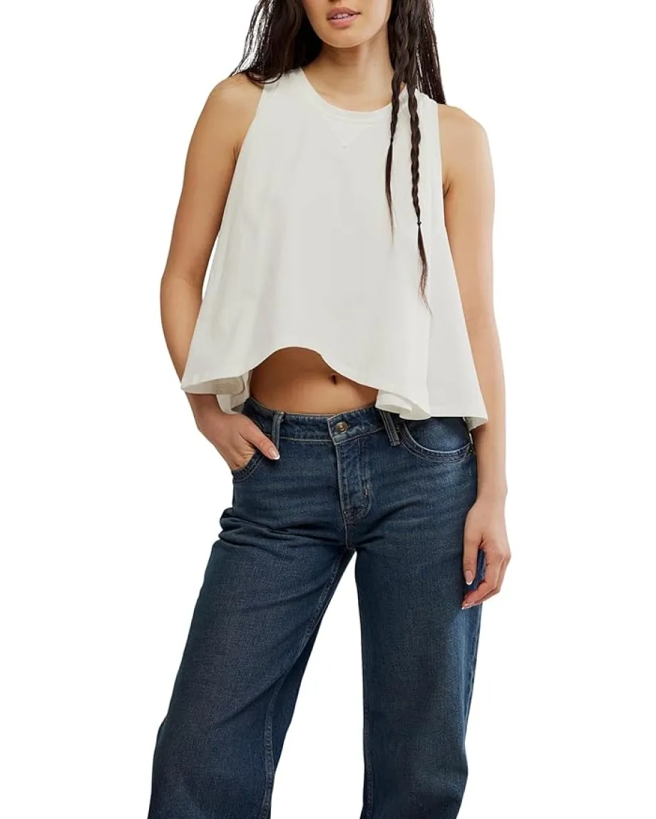 - Go with the flow in this billowy tee from We The Free, featured in a tank style with a drapey inverted hem and racerback for an essential, effortless staple. Pair with easy, breezy linen pants for a beachy look. Featuring a billowy jersey fabrication, high scoop neckline, V-stitch detail, drapey inverted hem, and a slight racerback design.