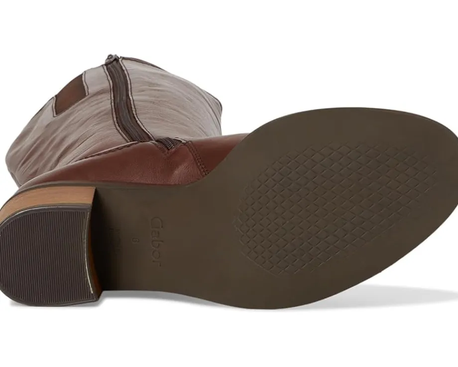 - The Gabor® Gabor 71.889.24 boots with stacked, block heels are perfect to dress up or down. Their soft, flexible rubber outsole makes them the right choice. These knee-high boots are made of a leather upper, insole, and lining. The zippered side closure offers easy on and off.