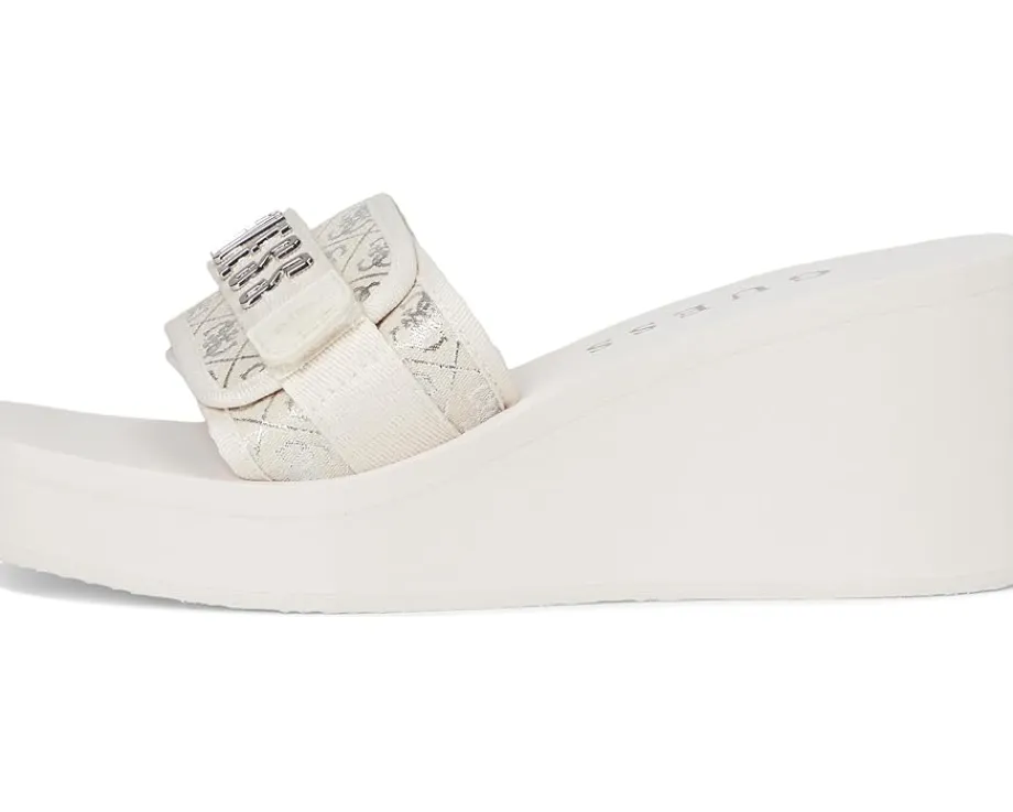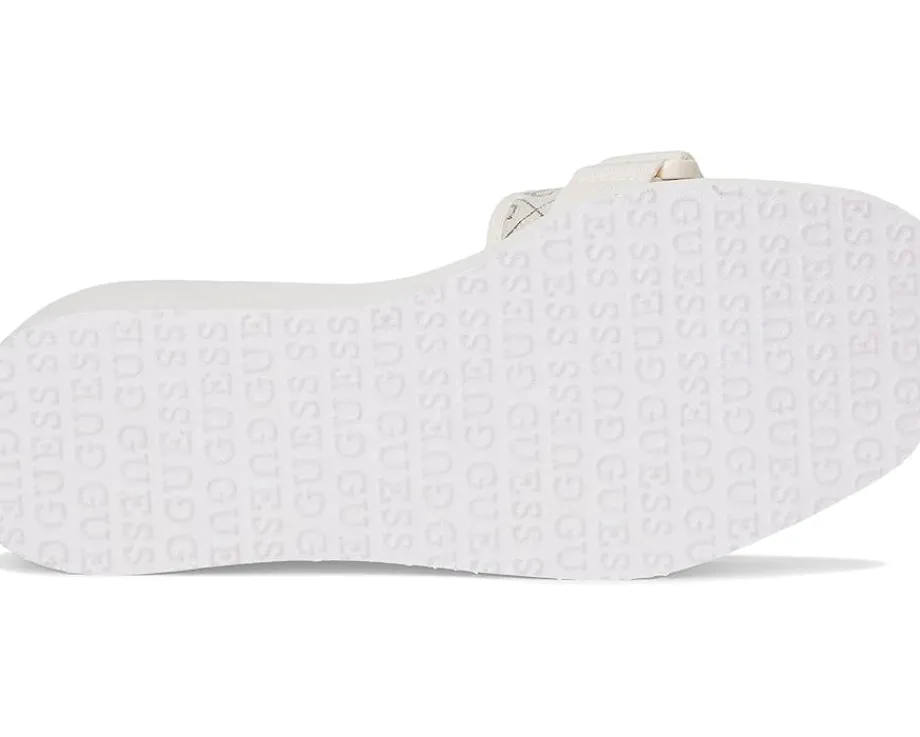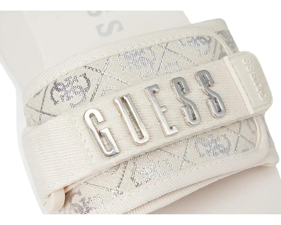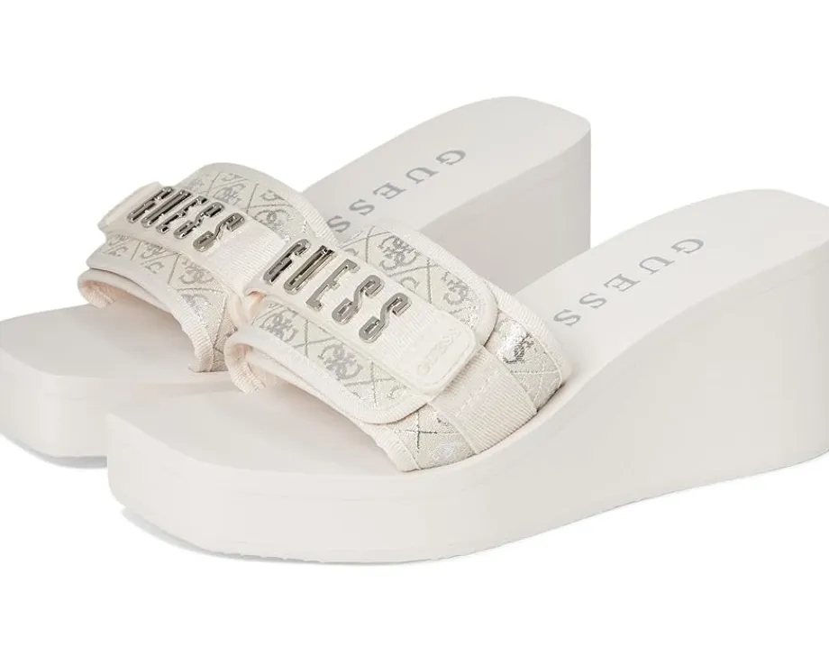 - Style that’s ahead of its time, GUESS® Dellean. Designed with a lightweight EVA upper and outsole, these wedges deliver a breezy, barely-there feel that’s perfect for warmer weather. The open square toe keeps your look modern and fresh, while the hook-and-loop single band strap offers a secure, customizable fit. Lined with synthetic rubber and set on a comfortable rubber insole, every step feels cushioned and confident. The signature Guess charm logo adds that unmistakable touch of glamour, ensuring your footwear makes a statement without saying a word.