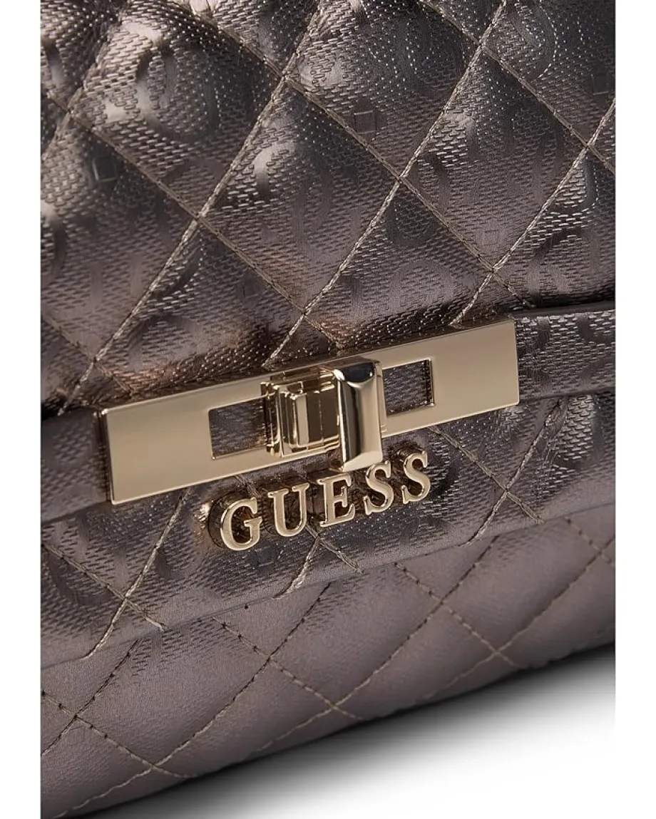 - The GUESS® Idra Top Handle Flap is a stylish handbag designed to elevate everyday looks. Crafted from eco quilted G Shine polyurethane, it features a structured silhouette with a detachable crossbody strap for versatile wear. The interior features a zippered pocket, two slip pockets, and four card slots for organized storage, while the shiny hardware adds a luxe finish.