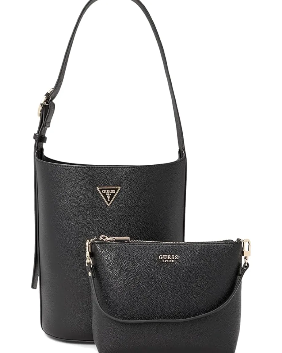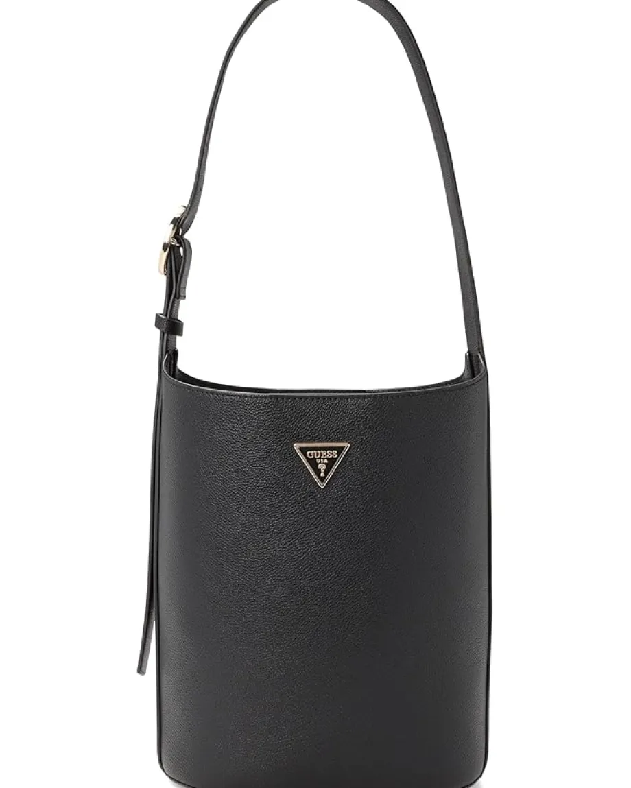 - The GUESS® Meridian II Bucket bag blends modern style with everyday function. This trendy bag is made from high-quality double-faced pebble polyurethane material, giving it a sleek and sophisticated look. The magnetic snap closure ensures your belongings are safe and secure, while the adjustable shoulder strap allows for comfortable wear. And with a removable zippered pouch featuring a detachable shoulder strap, you can easily transition from day to night with this versatile accessory.