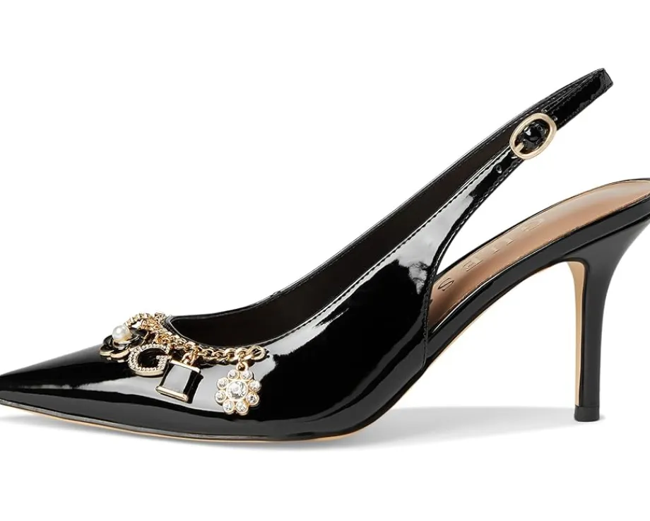 - The GUESS® Gwnaska heels are classic pointed-toe-shaped slingback pumps that get a charming touch. These heeled pumps are made of a polyurethane upper, cushioned insole, and synthetic rubber lining. They are accented with a chain with GUESS® charms hanging from it. Chic and classy, these pump shoes are perfect to style up your looks and outfits.