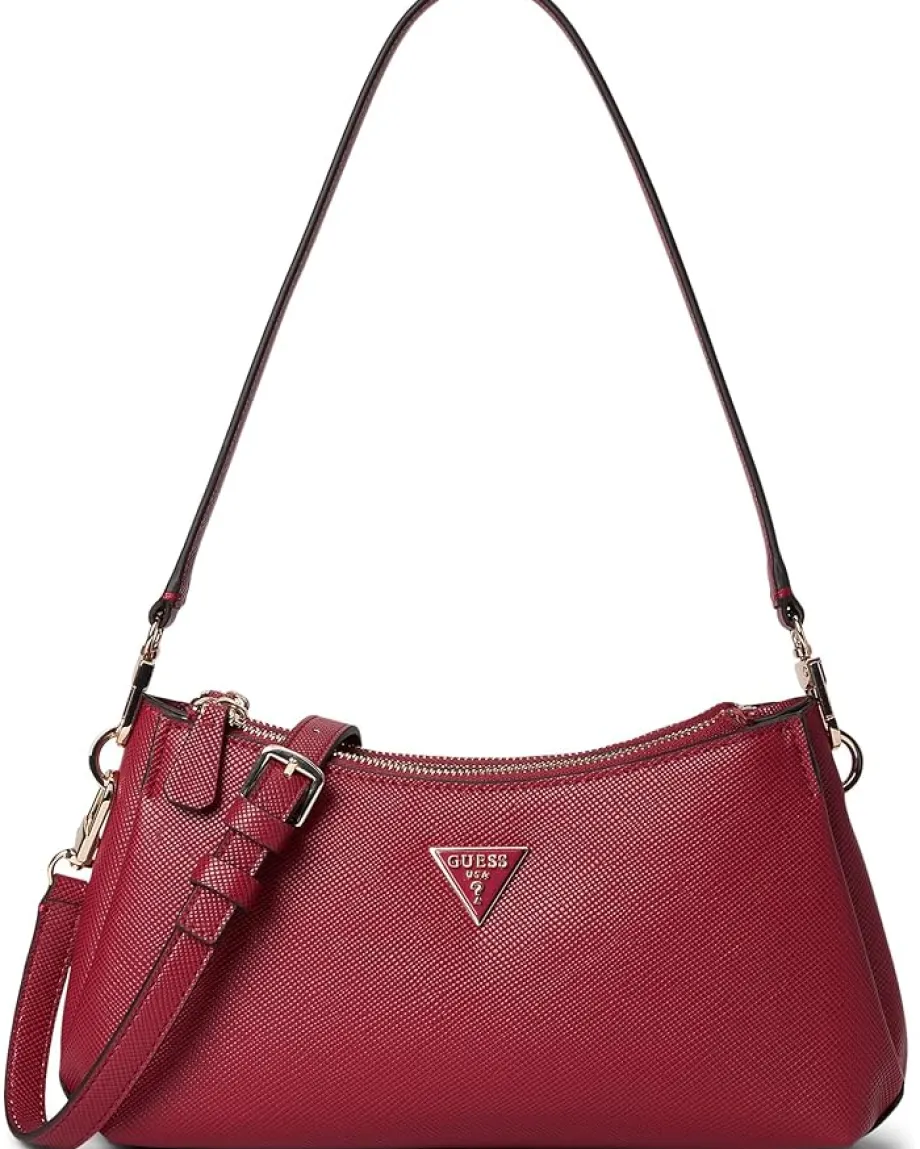 - The GUESS® Noelle Ii 3 Compartment Crossbody in eco saffiano polyurethane is designed with a detachable crossbody strap and a top strap for versatile styling options. This crossbody purse has three zippered compartments and three interior card slots that offer enough space for your essentials. Styled with shiny gold hardware, this shoulder purse is perfect to pair with dresses, casual outfits, and formal looks.