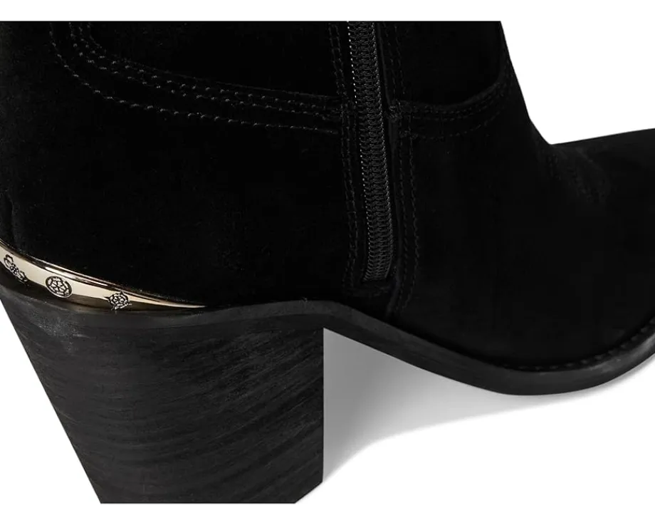 - The Sashan by Guess® offers a curved topline knee-high boot in beautiful suede materials. This stacked heel featuring topline stitching mimics Western flair. Made from soft suede upper, polyurethane lining, padded insole, and rubber outsole.