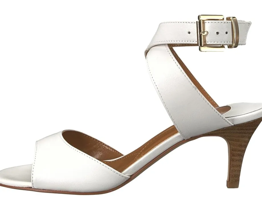 - Available in multiple materials with an open toe and wrap-around straps at ankle.