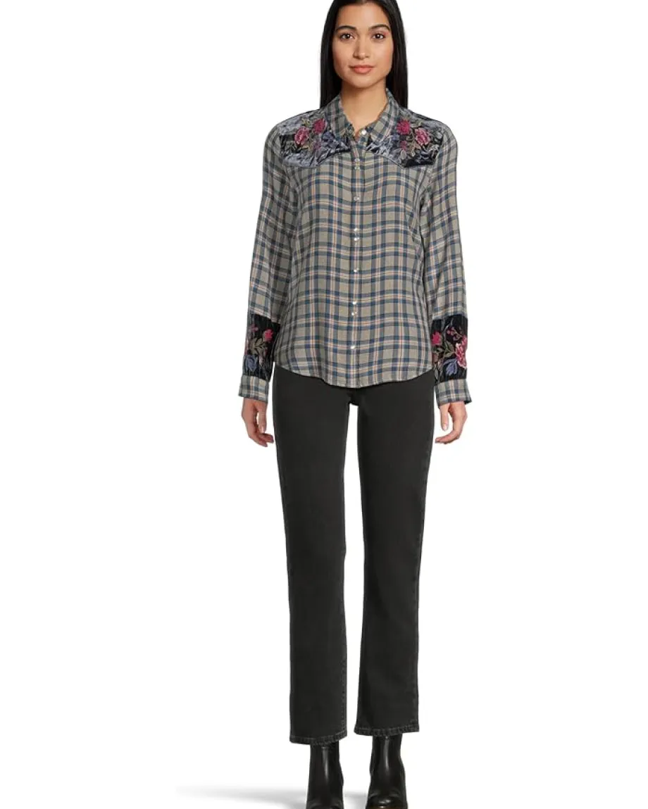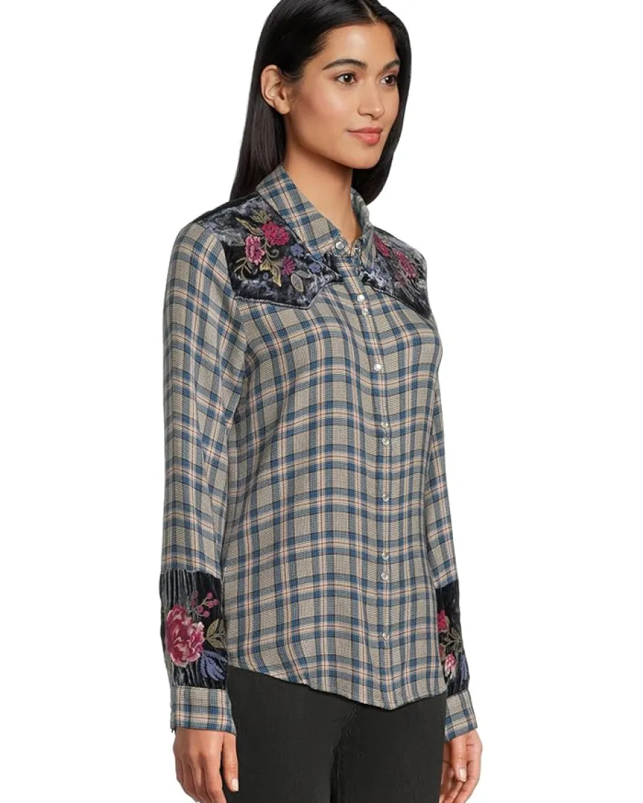 - A classic with a twist, the Johnny Was® Puff Sleeve Western Shirt – Sassiba plaid button-down is elevated by rich floral embroidery at the shoulders and cuffs. Relaxed yet polished, it’s the perfect blend of laid-back charm and feminine detail.
