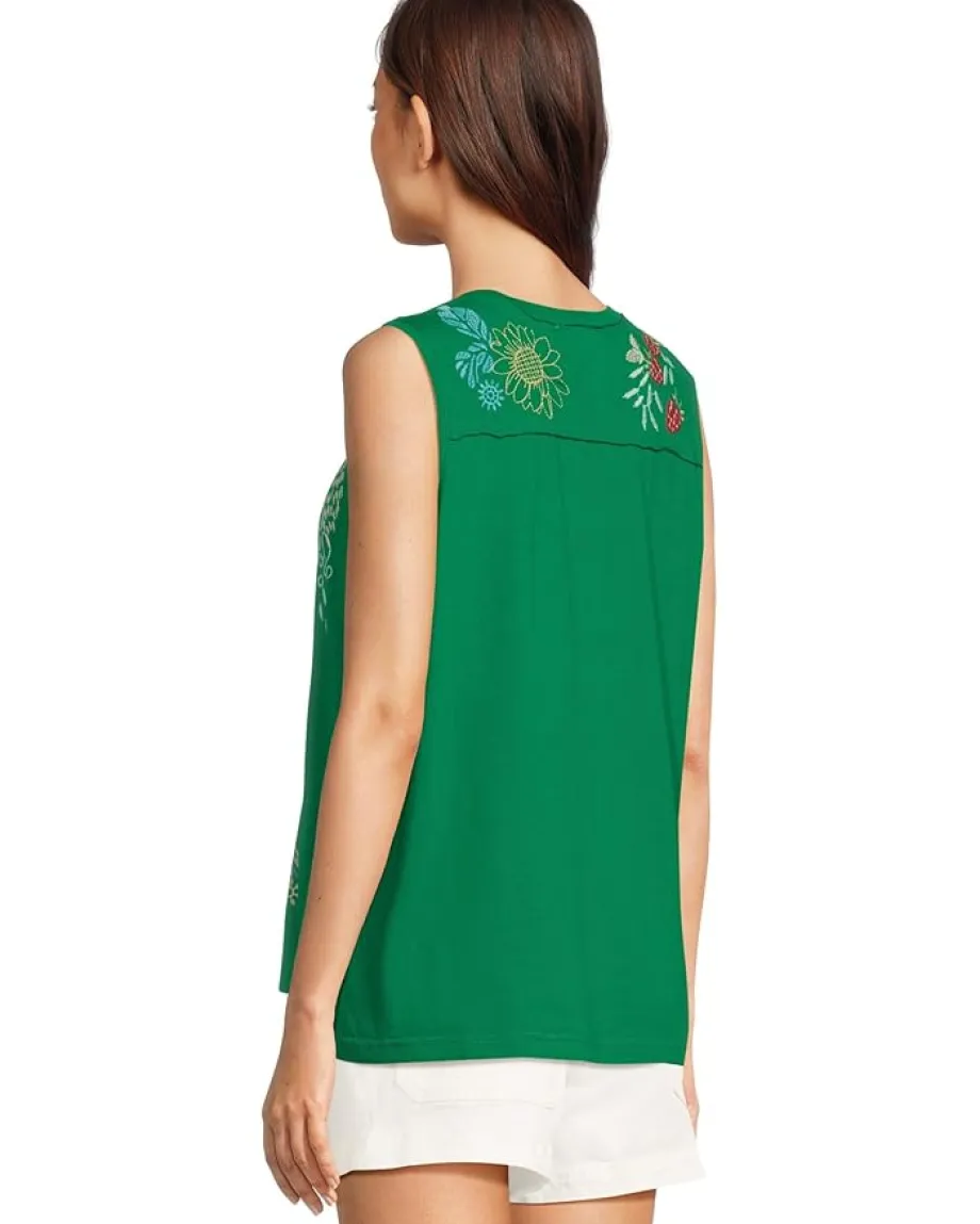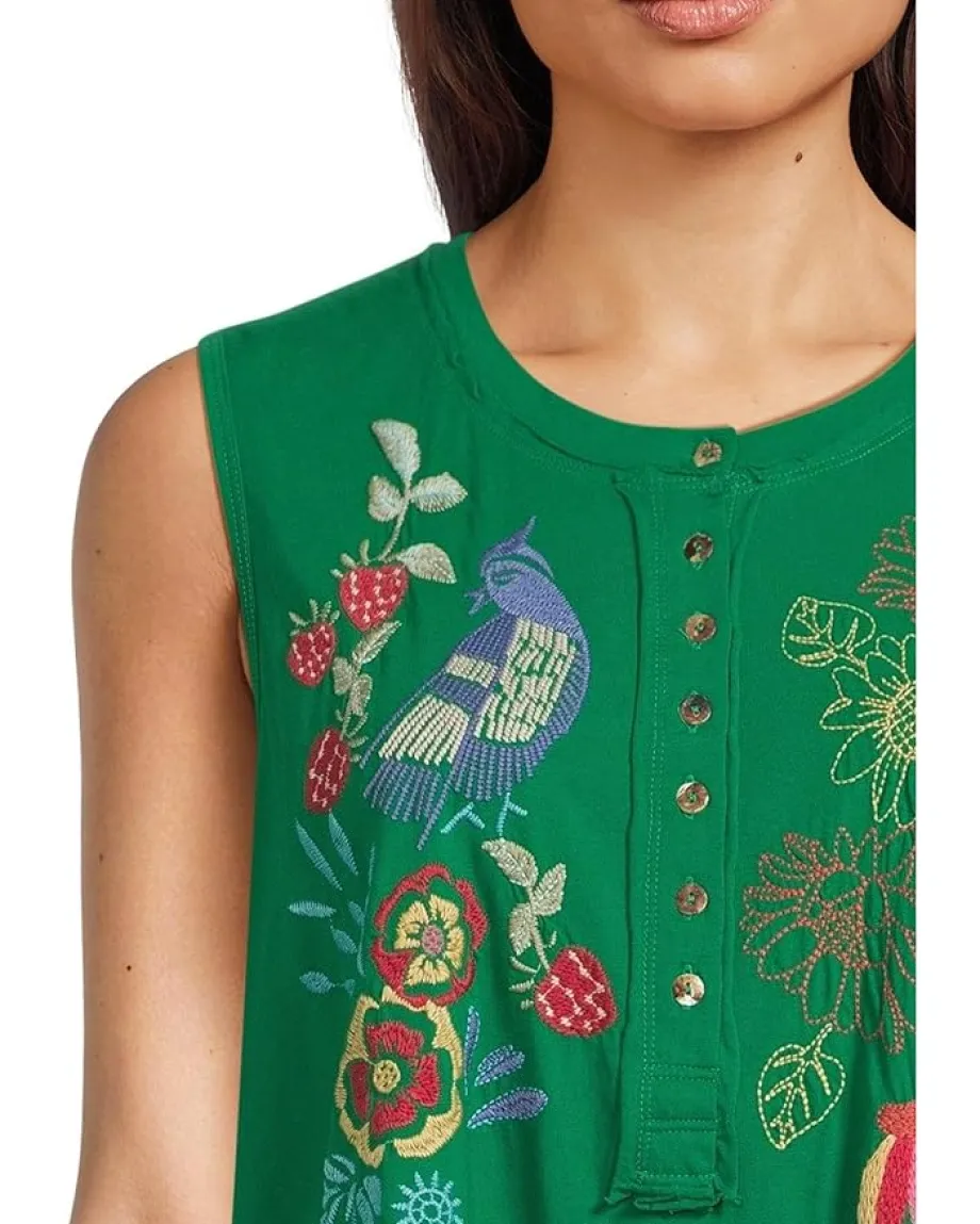 - Bright and cheerful, this sleeveless Henley top is bursting with personality thanks to its colorful floral and whimsical bird embroidery. The button-front detail adds a casual, laid-back feel, while the flowy fit keeps it breezy and flattering. A fun statement piece that pairs effortlessly with denim, shorts, or a skirt for an easy pop of charm.