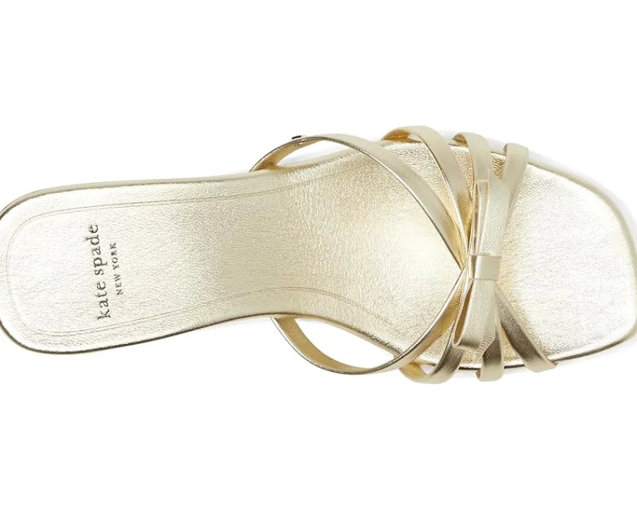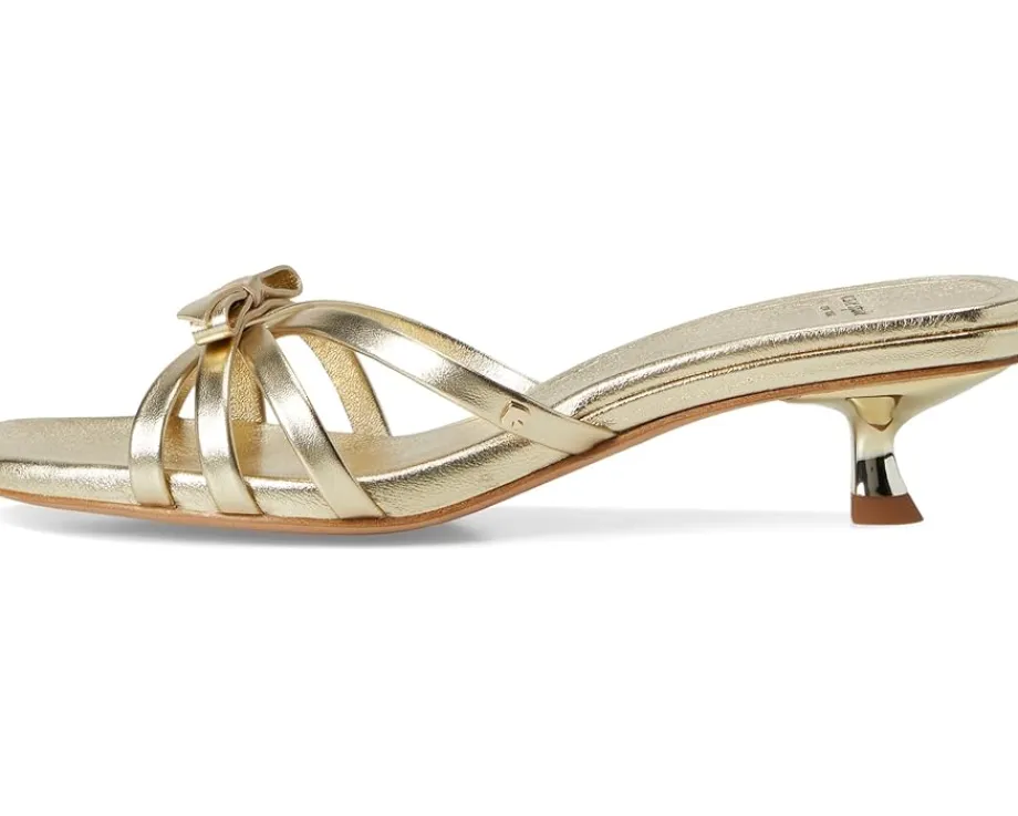 - Styled with a bow detail, the Kate Spade New York® Carolina Metallic Leather Kitten Heel Sandals are perfect to pair with your party gowns and dresses. These heeled sandals are made of a leather upper, insole, and lining. Comfortable and stylish, these slip-on heels make a great addition to your footwear collection.