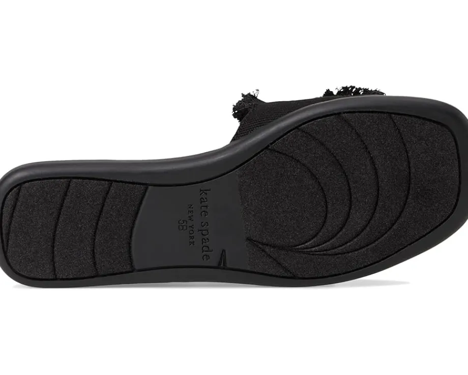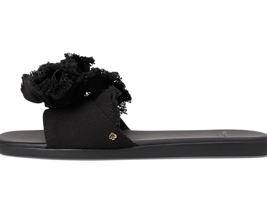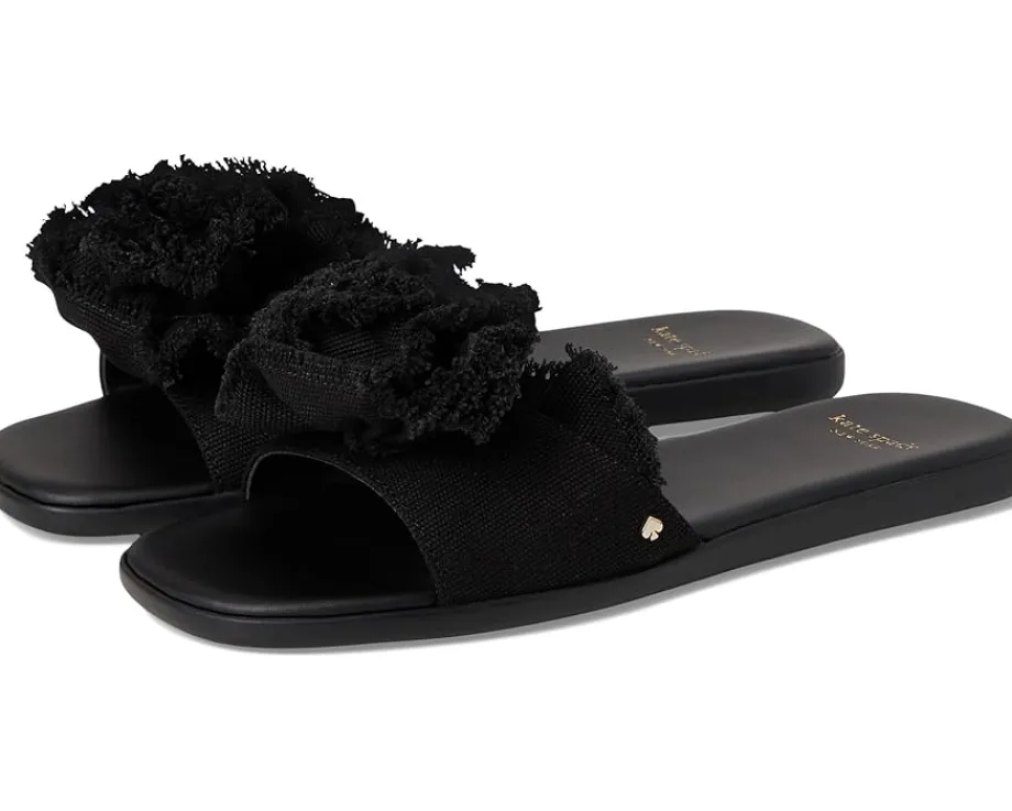 - Let your look blossom in effortless style wearing the Flourish Canvas Flat Sandal from Kate Spade New York®. Designed with a bold rosette accent featuring frayed edges, these slides bring a playful, feminine touch to your warm-weather wardrobe. The open square toe adds a modern edge, while the easy slip-on design ensures all-day comfort.