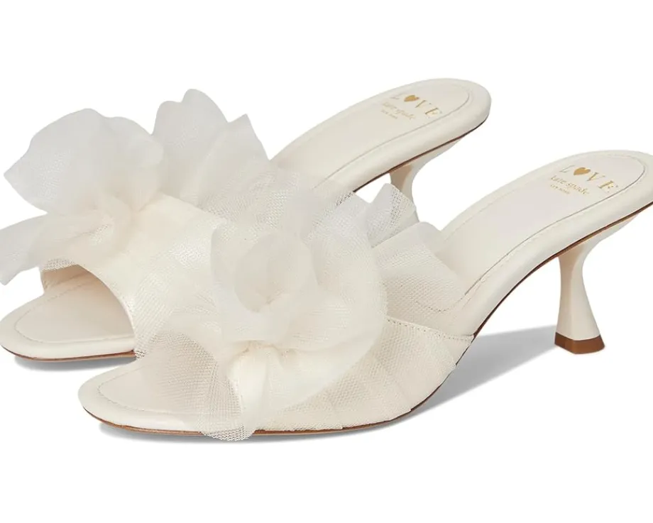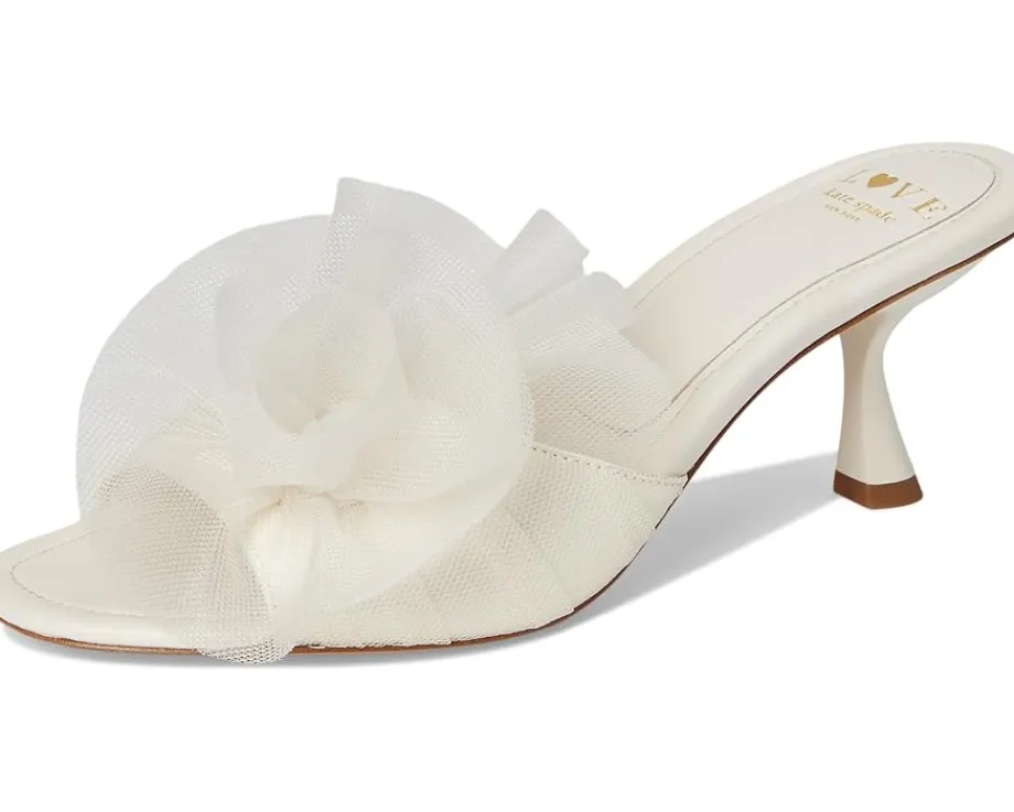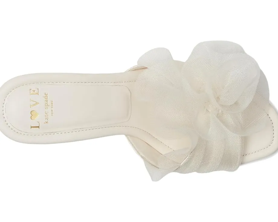 - Up your footwear game adding this Kate Spade New York® Flourish slip-on to your collection. It has leather upper with a 3D flower strap and slide on style. Lined with leather the slip on features open toe, leather insole and wedge platform.