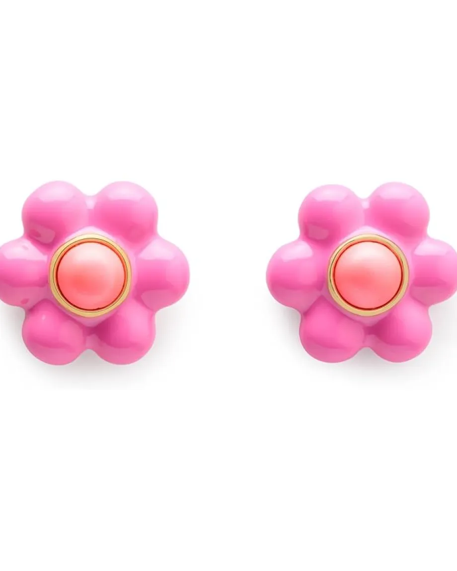 - Adorn your ears wearing the Kate Spade New York® Petal Puff Studs. Crafted from brass, enamel, cubic zirconia, it features flower shape, epoxy stone in the middle, push lock closure, and stud style.