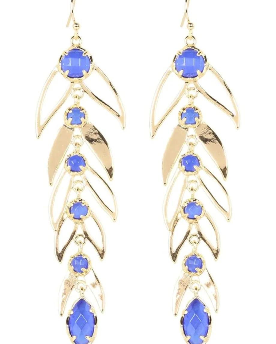 - 14K gold-plated brass earrings feature golden metal leaves that frame various semiprecious stones.