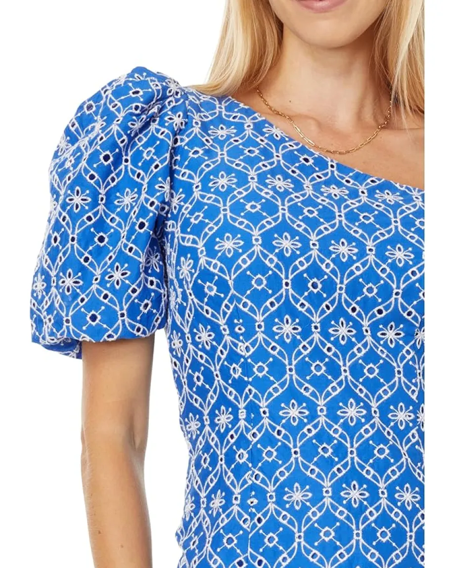 - Let the public eyes take a glance at your stunning look in this Lilly Pulitzer® Delilah One Shoulder Eyelet Top. It features a one-shoulder neckline with a one-sided short puffy sleeve.