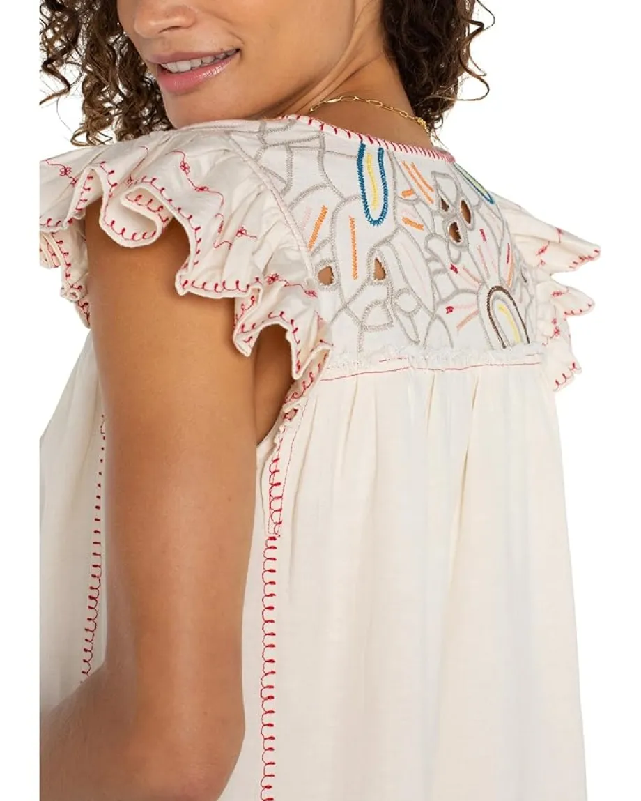 - Effortlessly chic with a touch of elegance! The Liverpoolâ„¢ Los Angeles Flutter Sleeve V-neck Woven Blouse With Embroidery is your go-to for versatile style. Designed with a flattering V-neck and a classic fit, this breezy beauty features delicate flutter sleeves that add a feminine flair. The intricate embroidery elevates the look, making it perfect for both casual outings and dressy occasions. Its easy pull-on design ensures all-day comfort, whether you pair it with denim shorts and sneakers for a laid-back vibe or style it with heels for a polished finish.