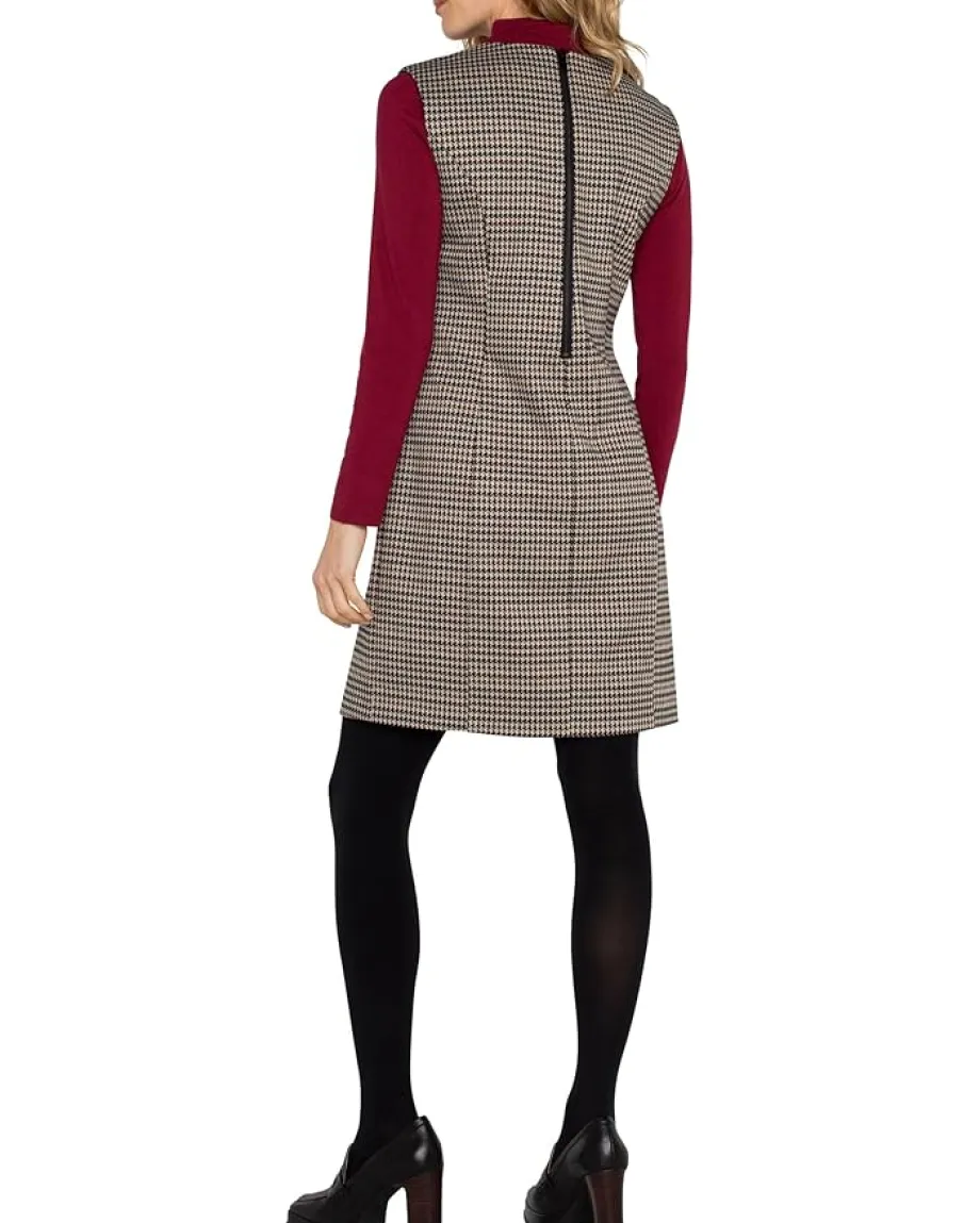 - Crafted with care and attention to detail and made in a beautiful black tan houndstooth fabric, the Liverpoolâ„¢ Los Angeles Sleeveless Shift Dress exudes timeless elegance with a modern flair. Its two front pockets add a touch of practicality without compromising style while the zippered back closure ensures a seamless fit, allowing you to slip into this dress with ease. This patterned dress comes with a sleeveless style, crew neckline, and straight hem. Elevate your outfit with classic black heels or opt for a more casual vibe with your favorite pair of loafers.
