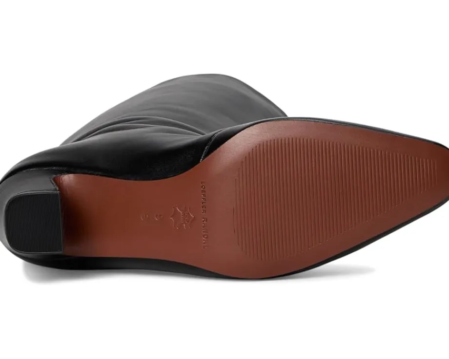 - The Loeffler Randall® Cleo Kicked Heel Calf Boots are heeled boots in brown split suede. They feature a padded leather footbed with a gold-stamped logo and a leather lining. The upper of these boots has a pull-on style for easy wear. These calf-high boots are perfect to style up your outfits and looks.