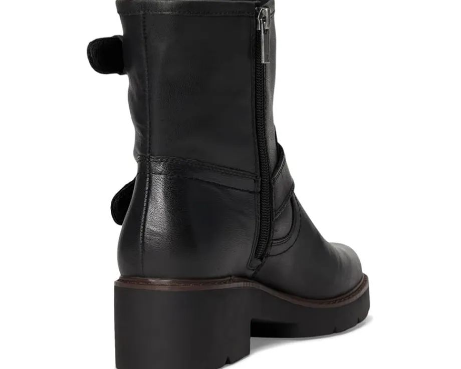 - A moto boot classic look in leather! The Lucky Brand® Migyn Double Buckle Moto Boots feature a double buckle detail, rubber outsole, leather upper, chunky block heel and zippered side closure.