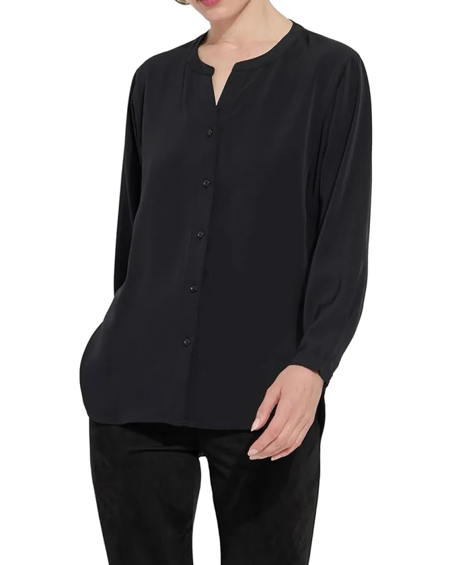 - Style your formal look or get into a party ensemble with the versatile simplicity of this solid Lysse® Mia Stretch Woven Top, a reliable choice for both office and coffee dates. The hip-length relaxed fit top offers dolman sleeves with L seam detailing, two times stretch, a rounded, high-low hem that’s easy to tuck, and generous proportions. It’s made from flowy Stretch Woven fabric with a crepe-like feel.