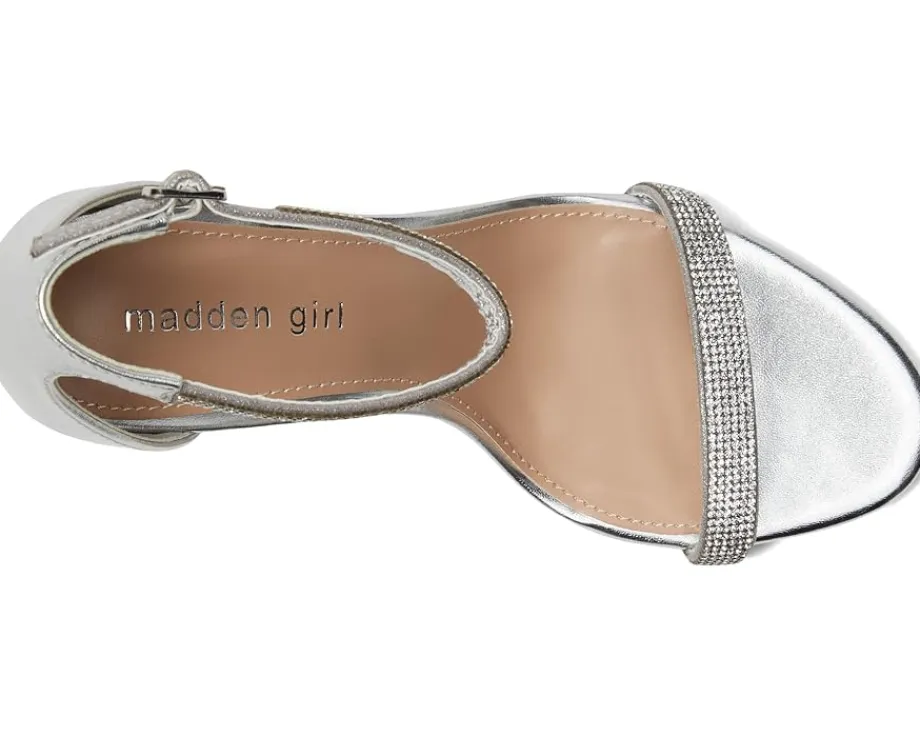 - Step into sophistication donning the Madden Girl® Brazen-R sandals, designed to add a touch of drama, glamor, and excitement to any outfit. Their PVC upper features rhinestone detail and an adjustable buckle closure on the ankle strap. These heeled sandals are made of a padded rubber footbed and polyurethane lining. Match your party outfits and chic styles with these sandals.