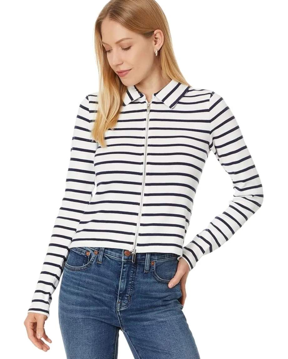 - Timeless design meets modern functionality in the Madewell® Grill Long Sleeve Zip Top – a laid-back essential with an effortlessly chic edge. Featuring a classic collared neck and trendy striped print, this top brings a polished vibe to your everyday style. The zippered front closure allows for easy layering and added versatility, while the long sleeves provide cozy comfort.
