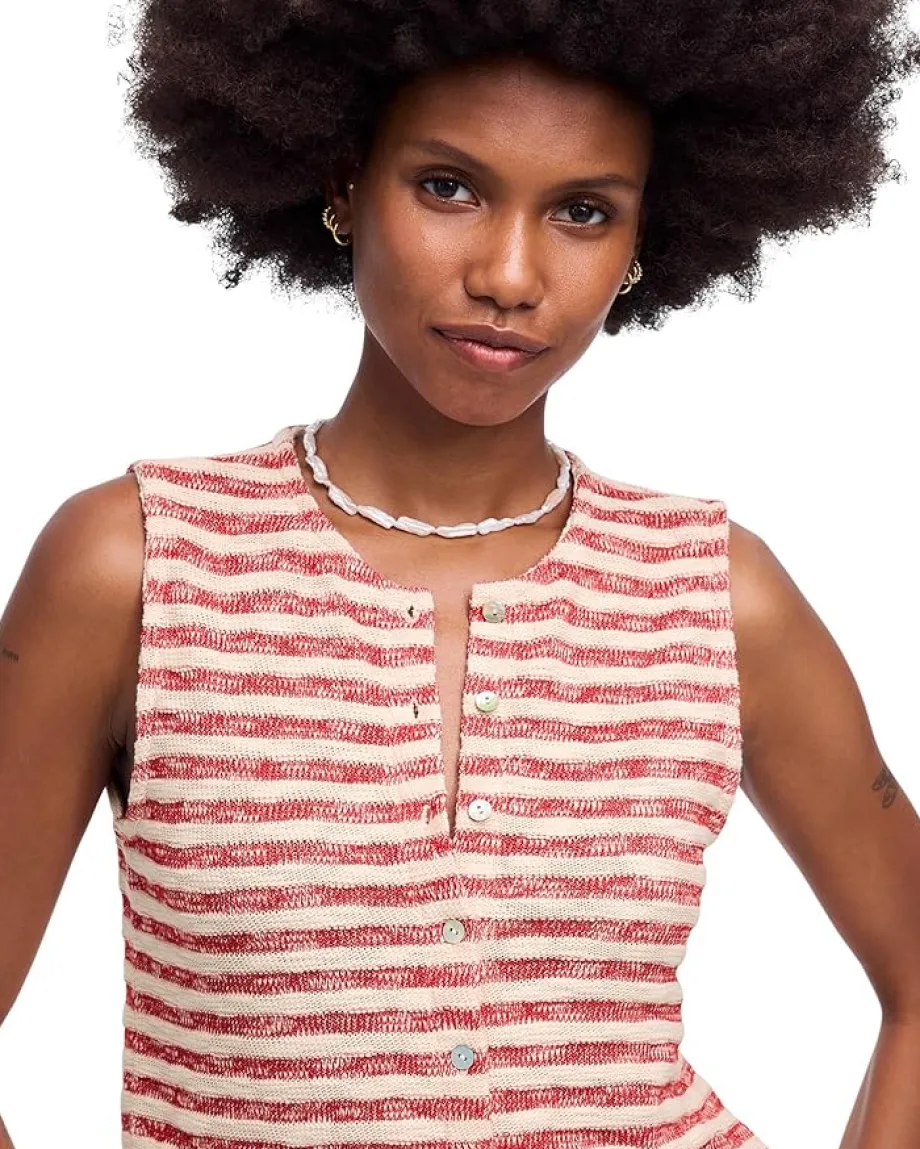 - Look bold, balanced, and beautiful wearing the Madewell® Texture Bacopa Vest. It features crew neckline, sleeveless style, regular fit, allover striped pattern, and straight hem.