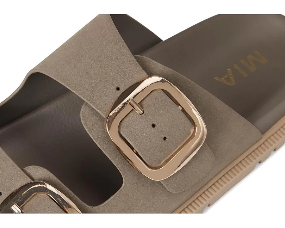 - Stride through the town in comfort and style wearing MIA™ Gen Sandals. Detailed with double buckle closures for easy adjustability, the slip-on style sandals are easy to wear and remove. These are crafted with a faux leather upper, faux leather lining, and an anatomical faux leather insole.