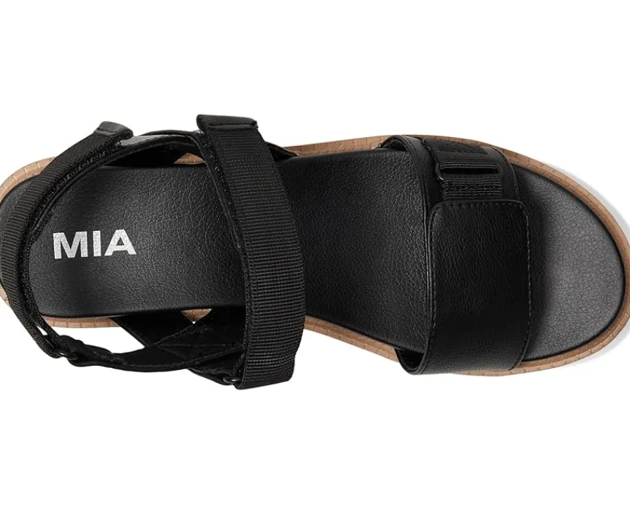 - Channelize your inner diva wearing the MIA™ Jony. Crafted from faux leather upper, lining, and insole, this pair of sandals features open round toe, adjustable ankle strap with hook-and-loop closure, ridged sole for extra flexibility and support, platform heel, and brand detailing on the footbed.