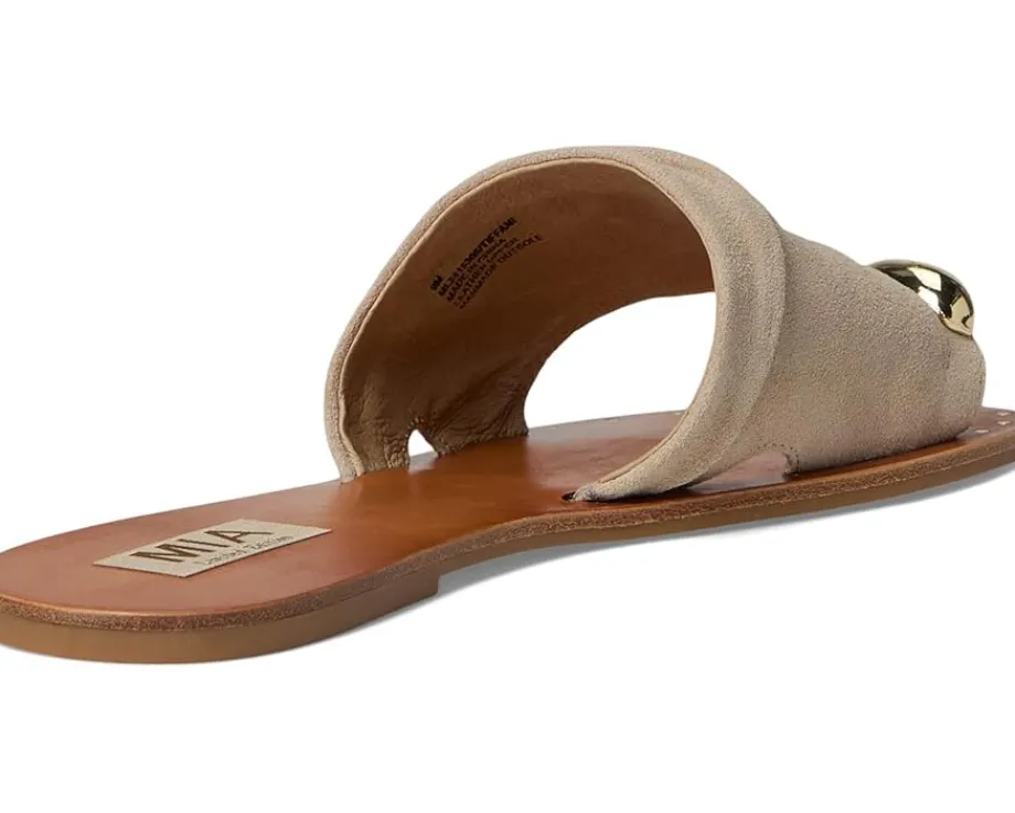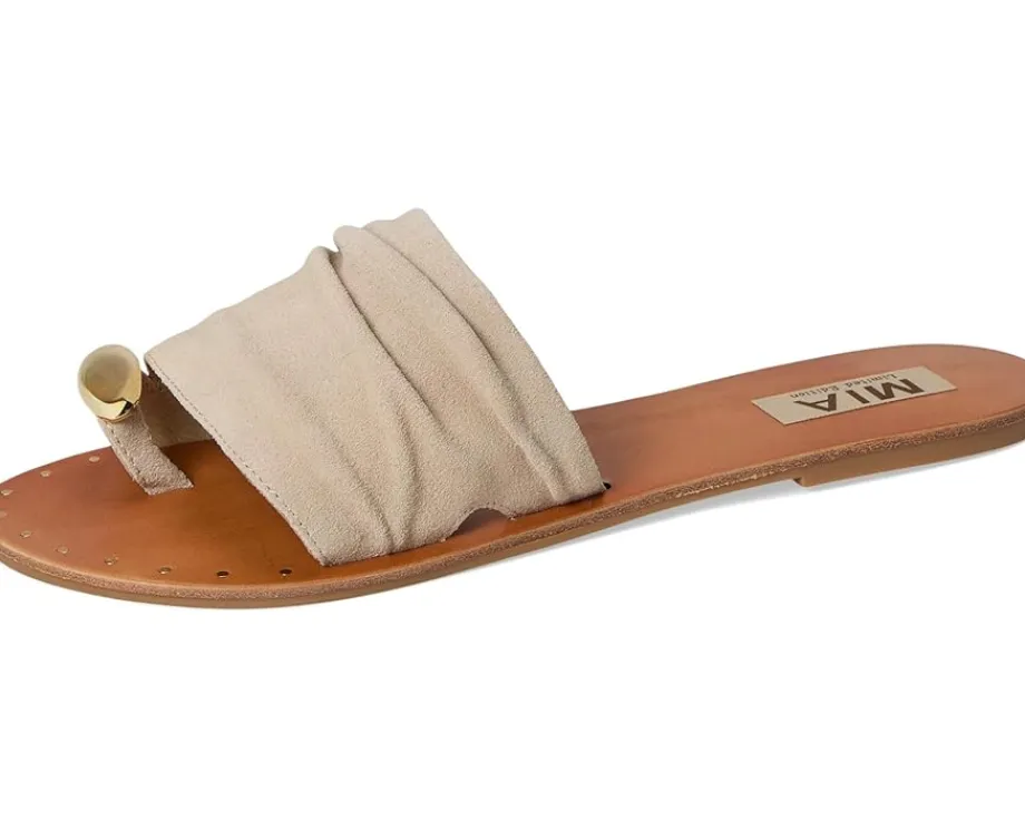 - Liven up your laidback look in the MIA™ MLE-Tiffani sandal. Featuring a genuine suede strap, flexible faux leather lining, nail head details, and a toe ring accent for a touch of glam.