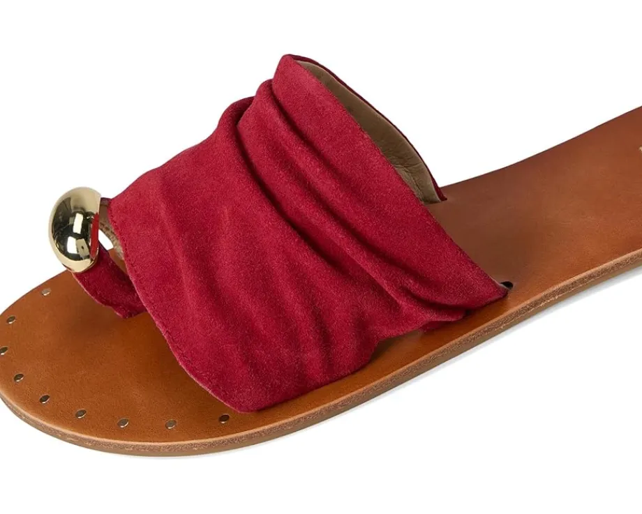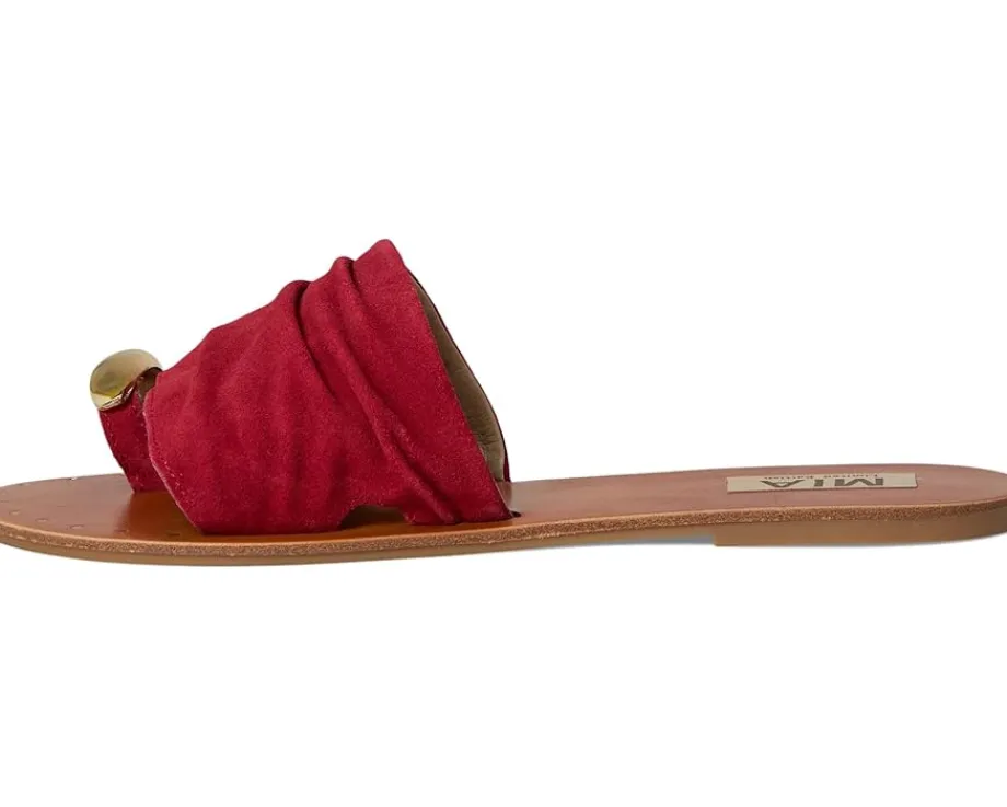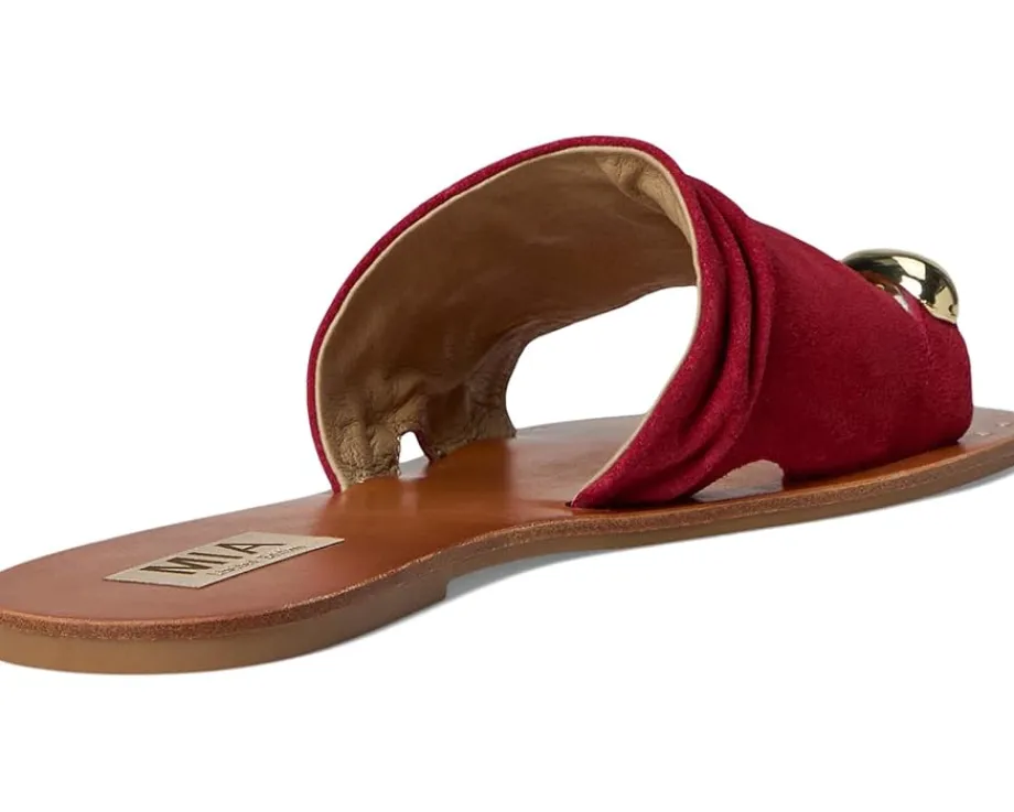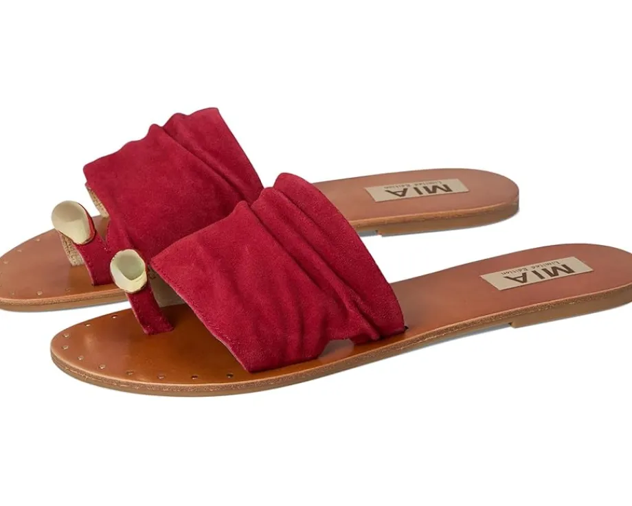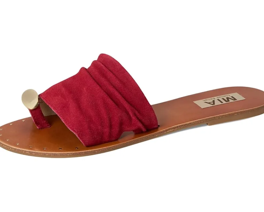 - Liven up your laidback look in the MIA™ MLE-Tiffani sandal. Featuring a genuine suede strap, flexible faux leather lining, nail head details, and a toe ring accent for a touch of glam.