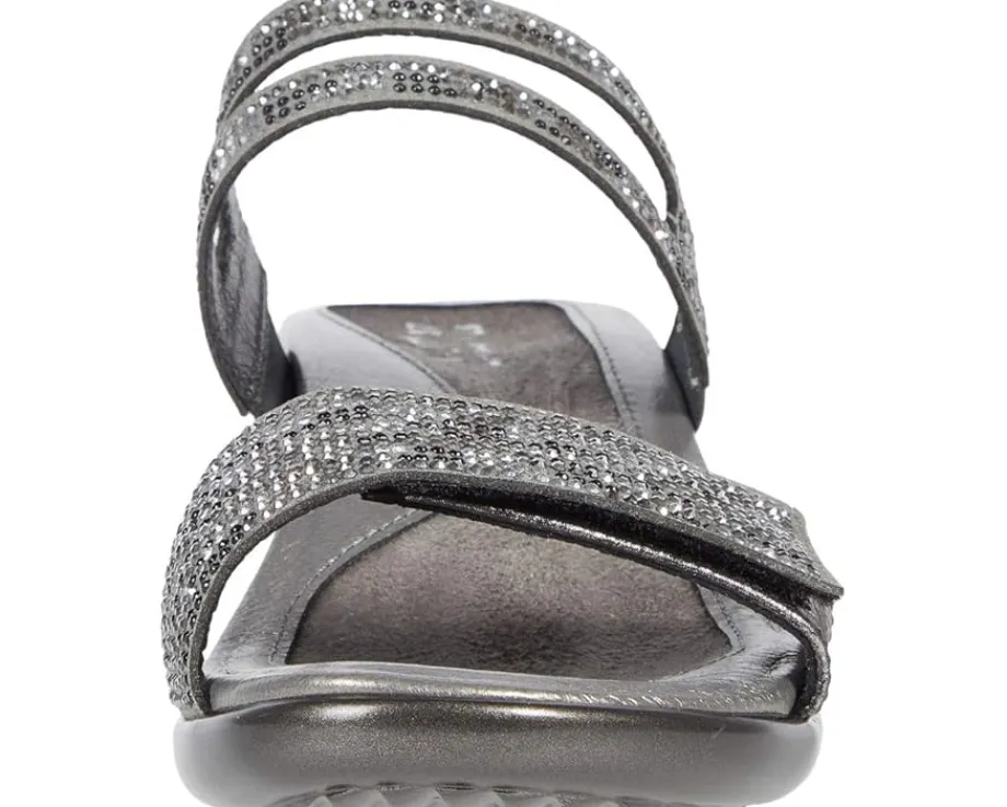 - Metallic leather upper with rhinestone detailing.