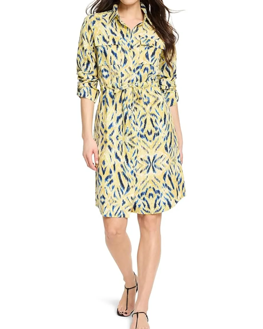 - Meet the new shirt dress silhouette, NIC+ZOE™ Sunny Skies Sydney Shirt Dress, paired with our cheery Sunny Skies print: the perfect bringer of good vibes for your everyday style. Made from an easy linen blend for breathability, with more of the drape, utility details like a button front closure, shirt collar, roll tab sleeves, two button-through flap pockets, and an allover print. Love the uneven shirt tail hem that’s slightly shorter at the sides to create some unique shape.