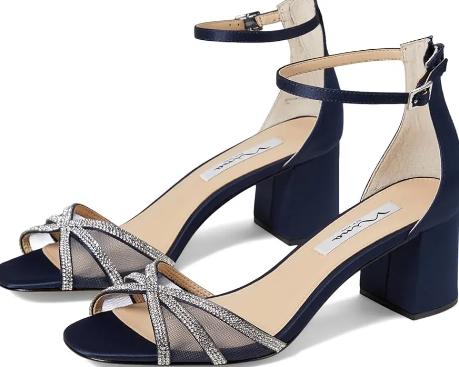 - Shimmery and sophisticated, the Nina™ Brooke Heels are sure to offer you a knockout style at your next party! Featuring a metallic foil and mesh upper with rhinestone-embellished vamp straps, the shoes possess an adjustable buckle strap closure on the ankle aaanda zippered back for a custom and securefit. The lining and footbed of these shoes are made of synthetic material that offers utmost comfort and flexibility during walks.