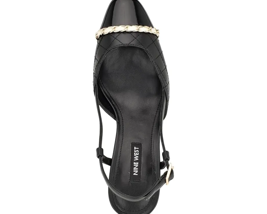 - Get this Nine Wes® Uround footwear to adorn from day to night on special occasions. It has faux leather upper, man-made lining, and comfortable insole. An almond toe in color-blocked design and chain detailing gives it a chic look. The footwear has mid block heel and slingback silhouette with buckle closure that sits perfectly on the ankles.