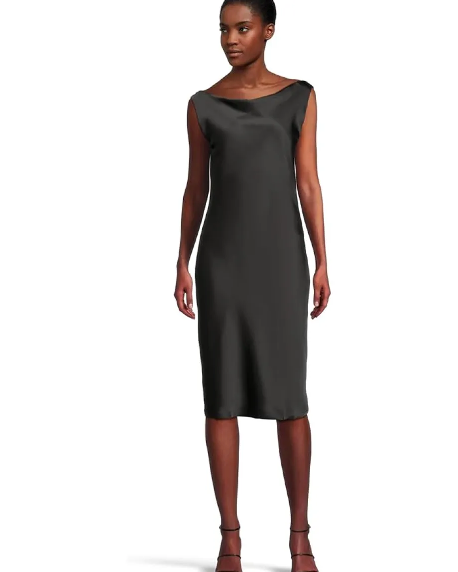 - The Norma Kamali® Sleeveless Low Back Drape Dress Below Knee features a sophisticated cowl neckline and a striking deep drape back. This midi dress is made from polyester fabric for all-day comfort and is styled with a straight hem. Designed with an invisible strap to maintain sleeve shape and a graceful below-the-knee length, this dress exudes elegance and modern allure.